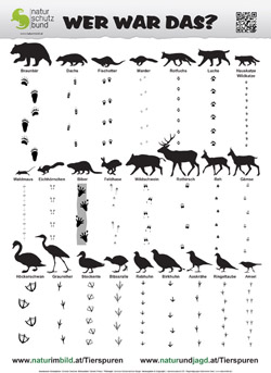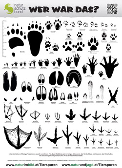 Du hast eine unbekannte Spur gefunden? Egal, ob Stockente, Fischotter, Biber oder Graureiher am Fluss, Rebhuhn, Feldhase oder Hermelin im Feld oder Wildschwein, Reh, Rothirsch oder Luchs im Wald - du kannst sie alle anhand von Zeichnungen auf einen Blick bestimmen. Der Poster verweist zudem auf diese Homepage, die einen online-Spurenlesekurs und weitere Informationen über heimische Wildtiere beinhaltet.