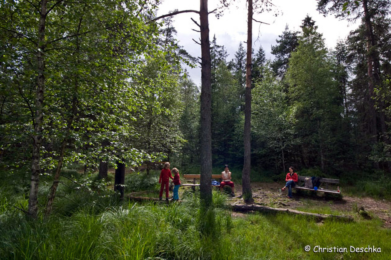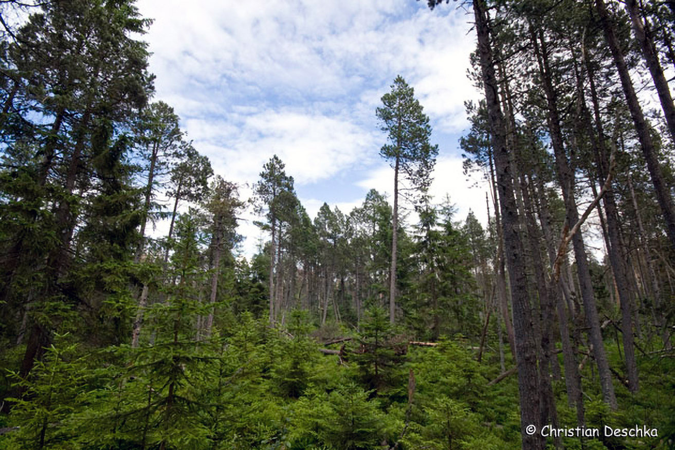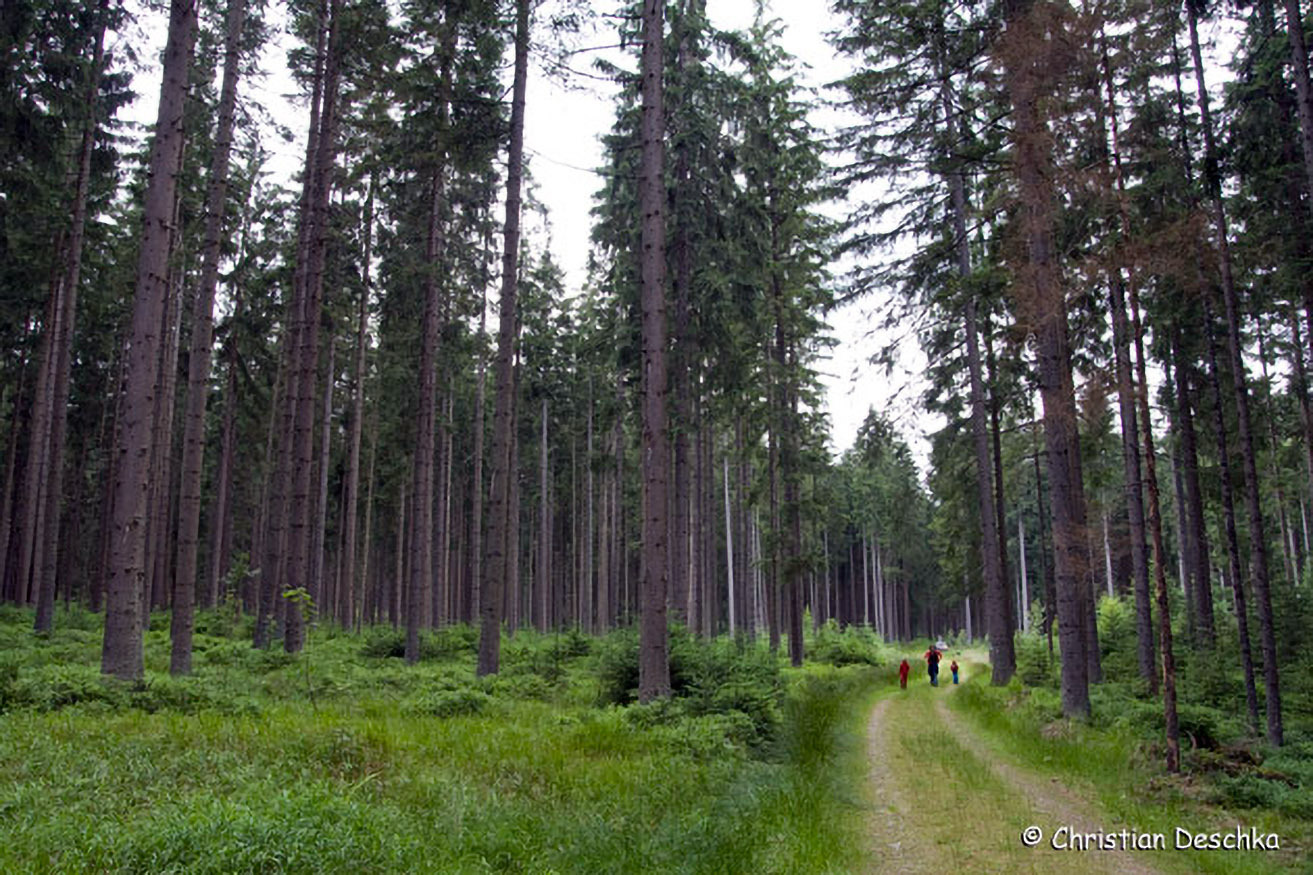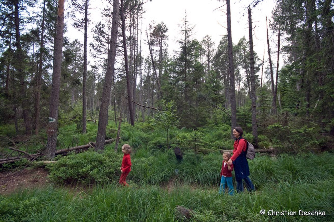 Wie in weiten Teilen des Böhmerwaldes, so hat auch hier der Borkenkäfer seine Spuren hinterlassen. Ein Teil der Bäume ist dürr, manche davon sind umgefallen oder wurden gefällt.