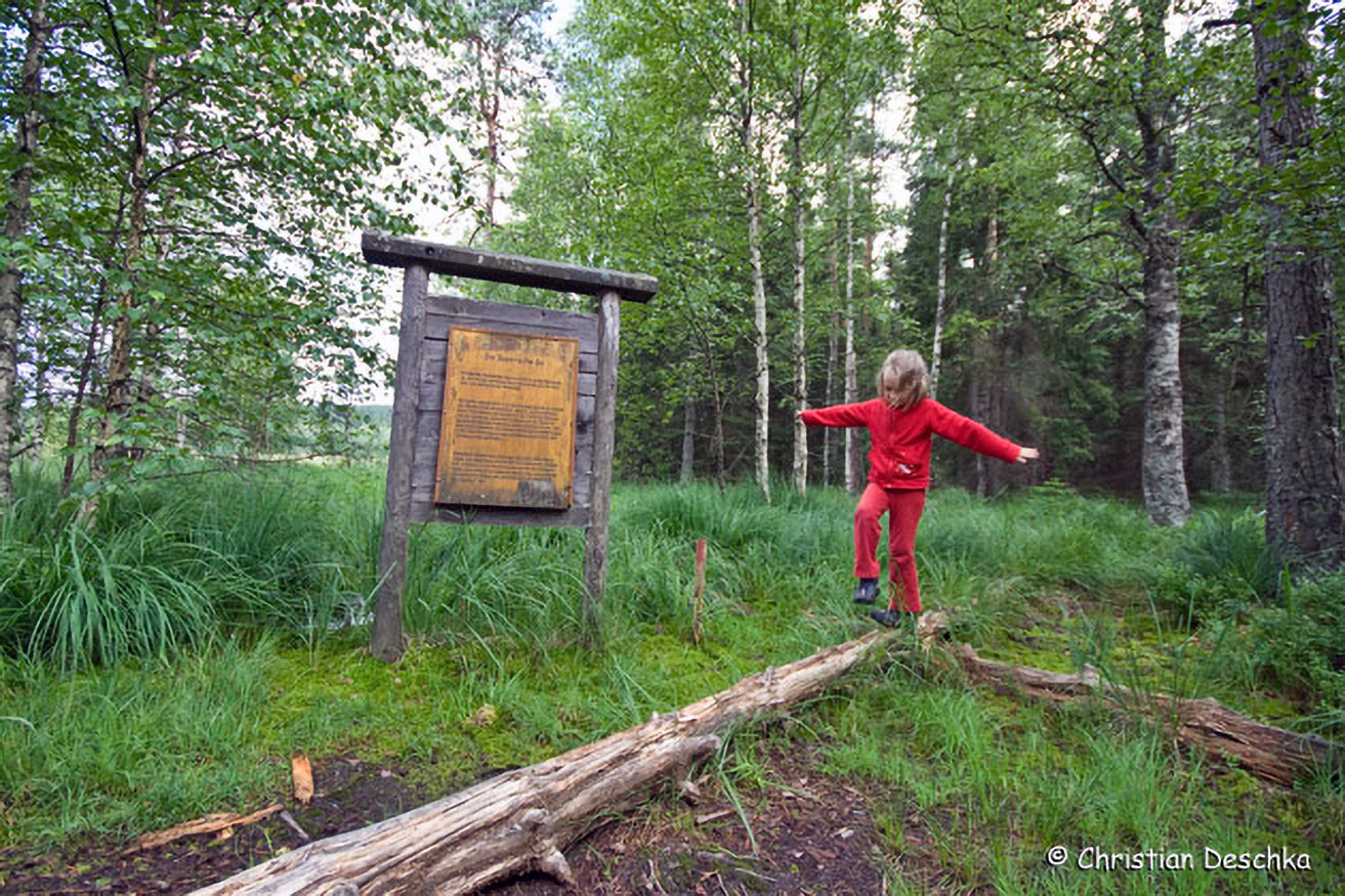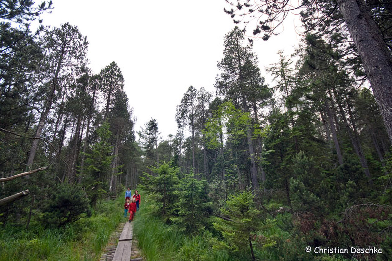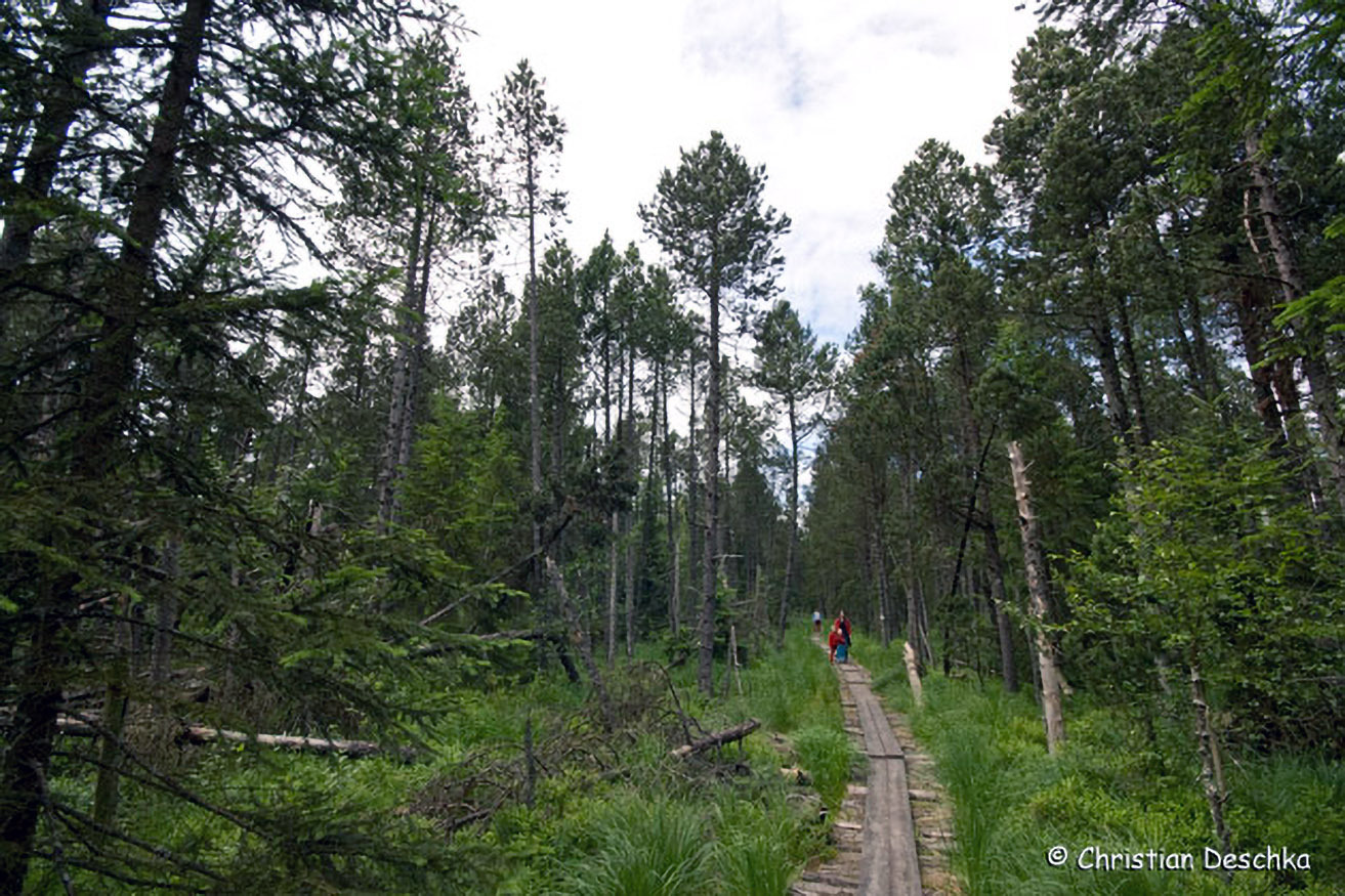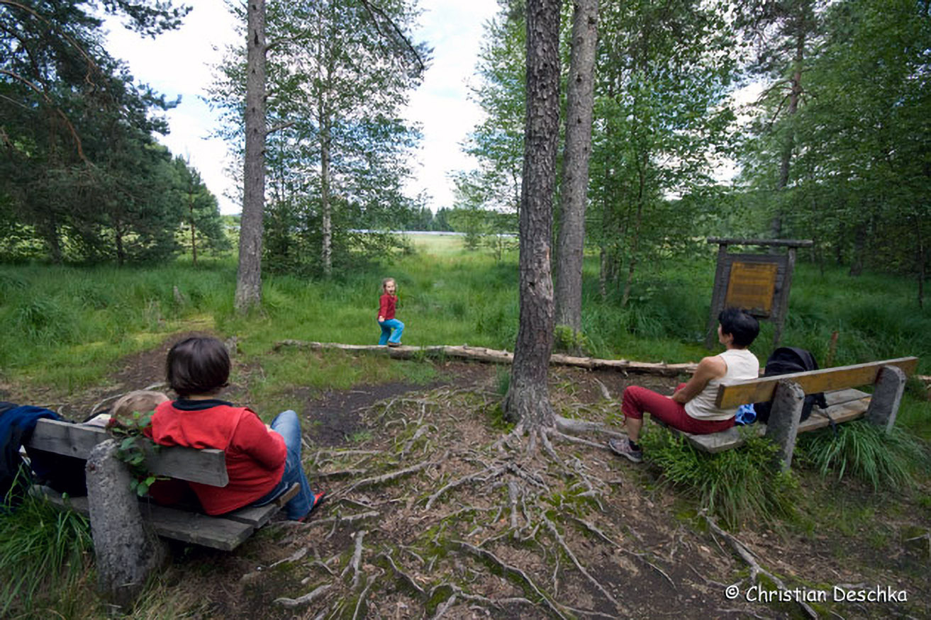 Eine Tafel stellt diesen besonderen Lebensraum kurz vor und informiert darüber, dass dieses Moor in der Zwischenkriegszeit durch Torfstich zur Heizmaterialgewinnung gefährdet war.