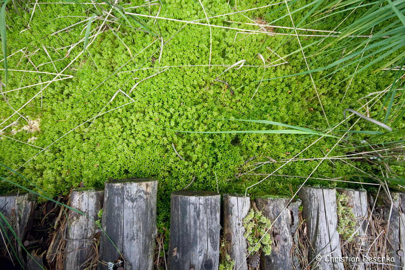 Neben dem Weg sehen wir überall Moose. Diese wachsen an der Spitze und sterben an der Basis ab. Da die abgestorbenen Teile im nassen Boden mangels Sauerstoff nicht verrotten können, bildet sich Torf - eine dunkle, erdartige Masse.