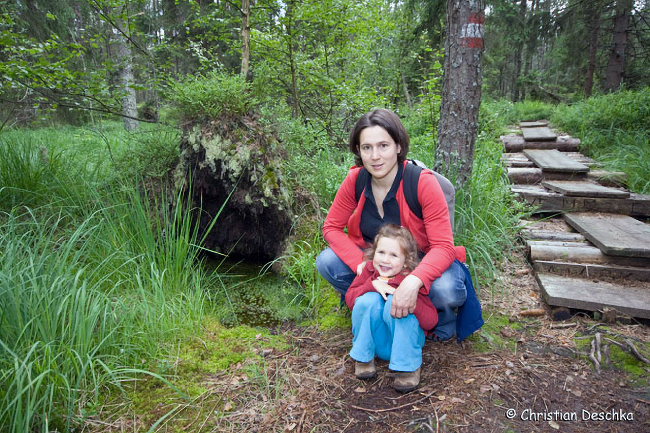 Diese Moorbesucher stehen neben einer Rotföhre, die im oberen Stammabschnitt orange gefärbt ist. Die in der rechten Bildhälfte zu sehenden Spirken haben einen bis zum Wipfel dunkel gefärbten Stamm.
