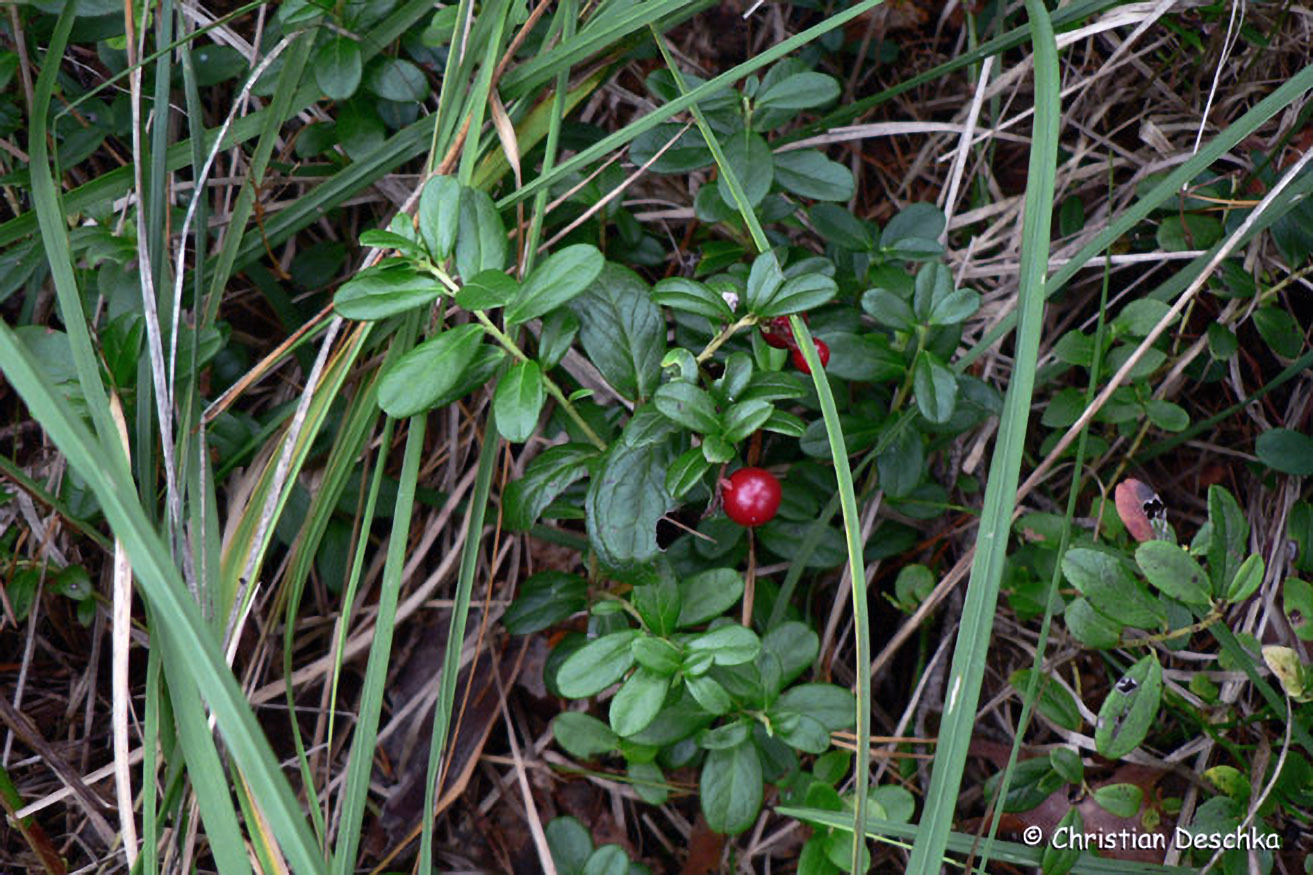 Die Preiselbeere erkennen wir an den ledrigen, ovalen Blättern und den roten Früchten. Letztere sind insbesondere als Marmelade ("Steirerketchup") eine beliebte Beilage zu Wildgerichten.
