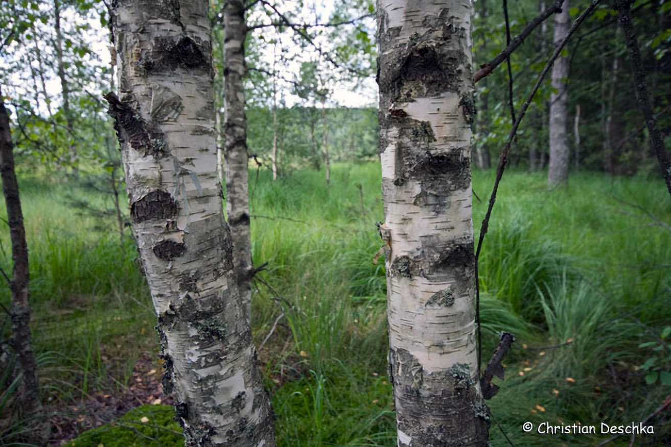 Im Moor wächst auch eine besondere Birkenart - die Moorbirke. Ihre Stämme sind nicht so rein weiß wie jene der in der Kulturlandschaft häufigen und weitverbreiteten Hängebirke.