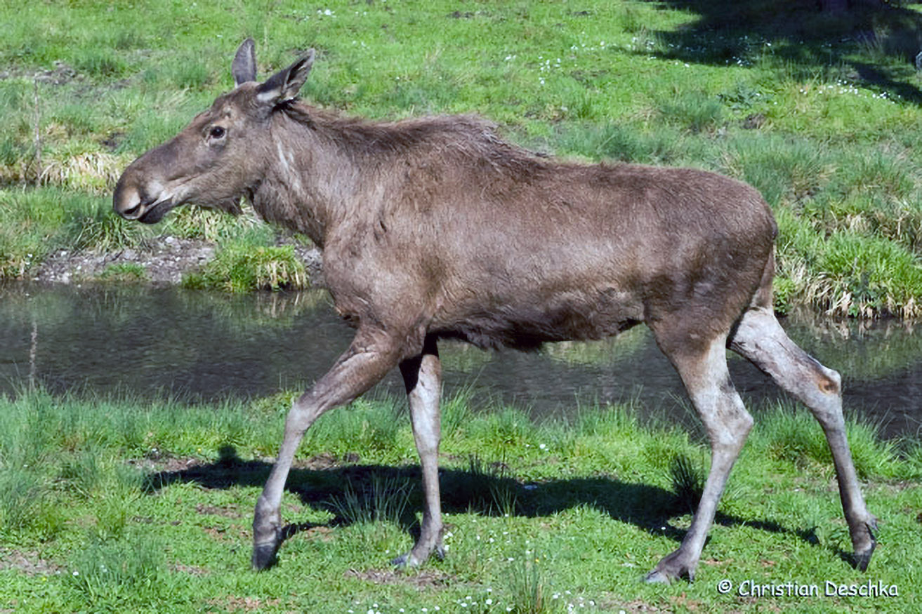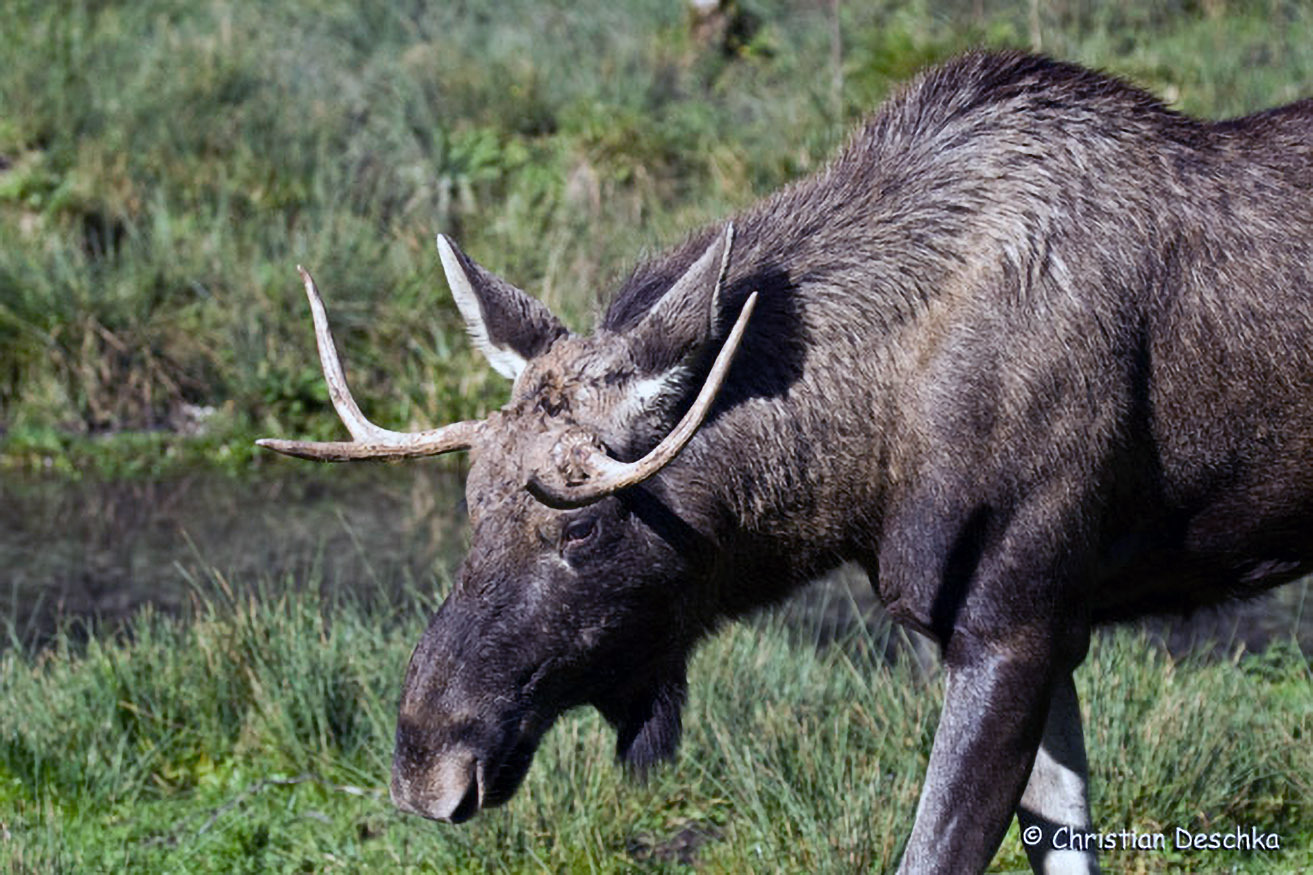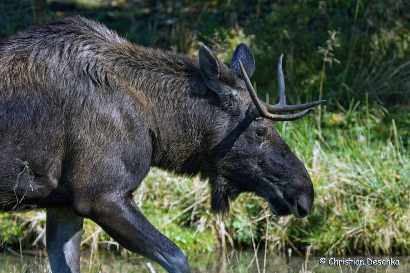 Der Elch liebt wasserreiche Landschaften. Kleine Schwimmhäute zwischen den Zehen machen ihn zu einem hervorragenden Schwimmer.