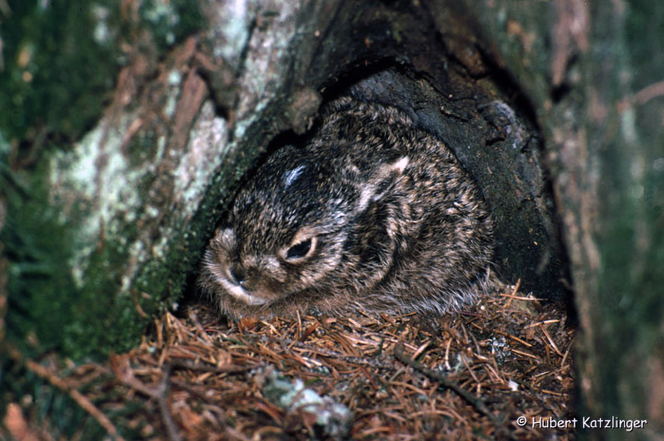 Die Nestflüchter sind von Anfang an großteils auf sich gestellt. Die Häsin sucht sie nur einmal pro Nacht auf, um sie zu säugen. Dieser Junghase findet zwischen den Wurzeln eines Baumes Schutz.