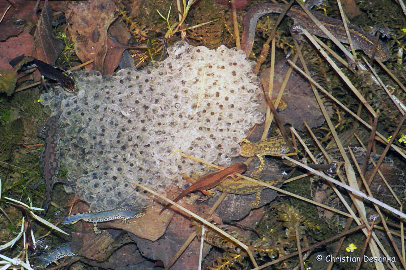 Während Erdkröten schnurförmig ablaichen, sind die Laichballen der Grasfrösche klumpenförmig. Solche flachen und sonnigen Flachwasserbereiche sind für die Jungenentwicklung besonders günstig.