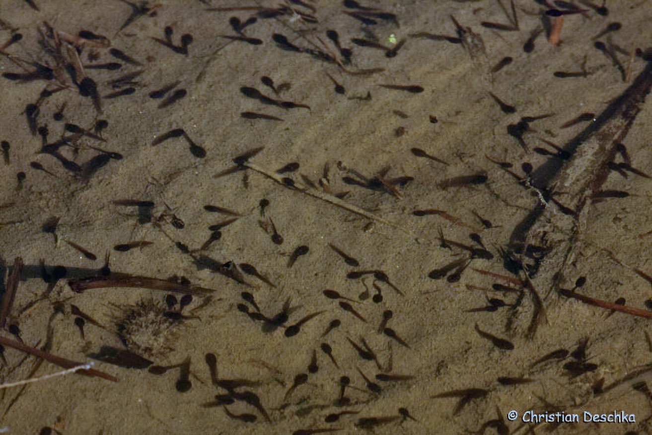 Die Entwicklung vom Ei zum Jungfrosch dauert rund 2 - 4 Monate. Gelbrandkäfer, Libellenlarven etc. dezimieren den Nachwuchs ständig.