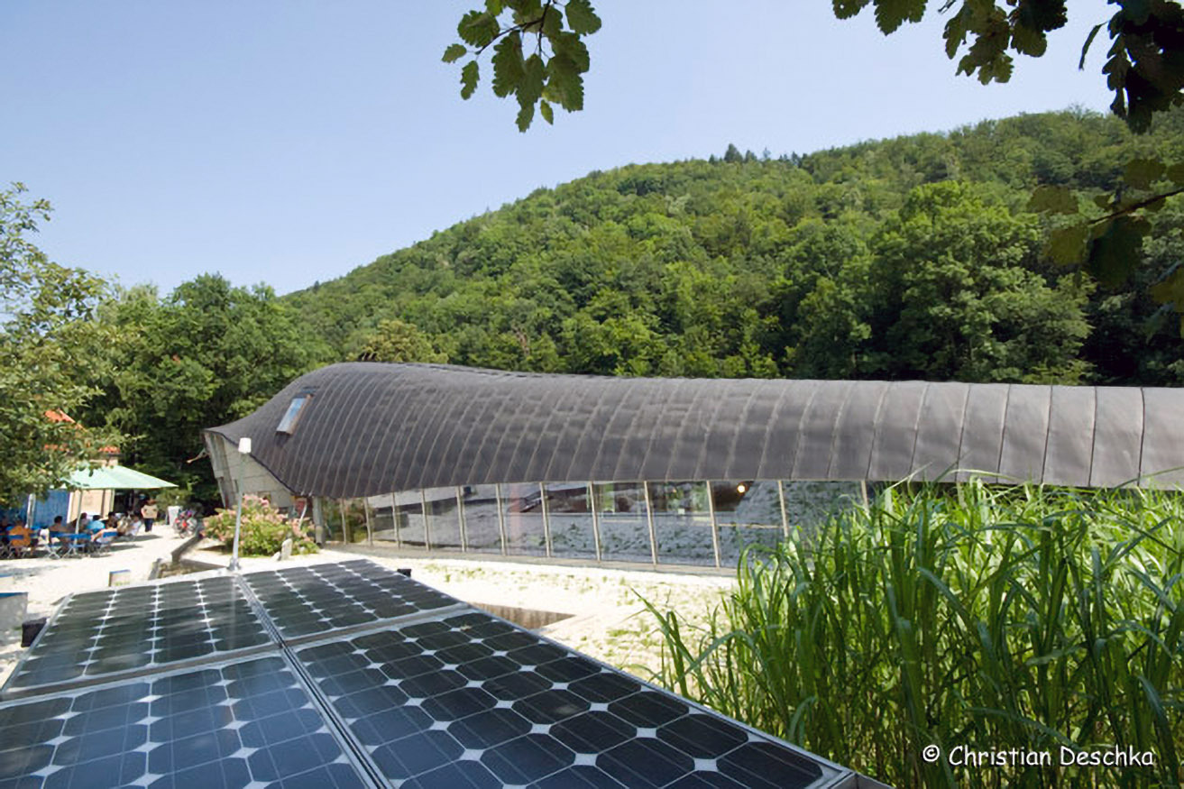 Das Gebäude beeindruckt von außen durch seine außergewöhnliche, stromlinienförmige Architektur.