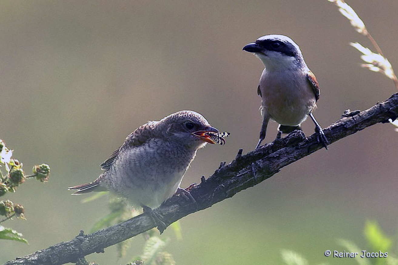 Auch der Neuntöter ist ein klassischer Heckenbewohner. Er nutzt Strauchspitzen als Jagdwarte für den Fang von Insekten und brütet regelmäßig in dichten Dornensträuchern. Hier sehen wir ein Männchen, das gerade ein Junges gefüttert hat.