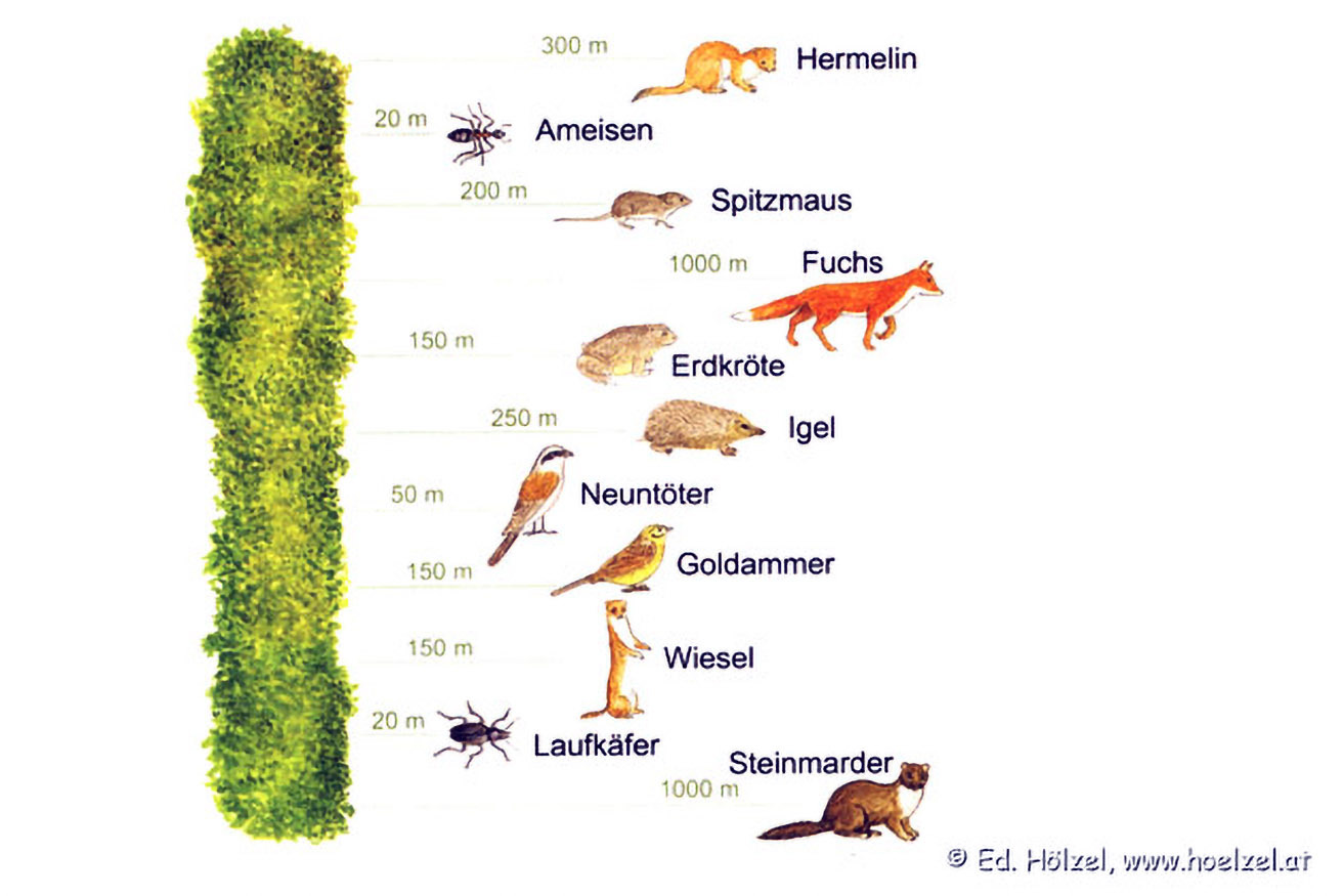 Die Distanz, die sich Tiere üblicherweise von der Leitlinie Hecke entfernen, ist je nach Art recht unterschiedlich. Sie reicht von 20 Metern bei Ameisen und Laufkäfern bis zu einem Kilometer bei Fuchs und Steinmarder.