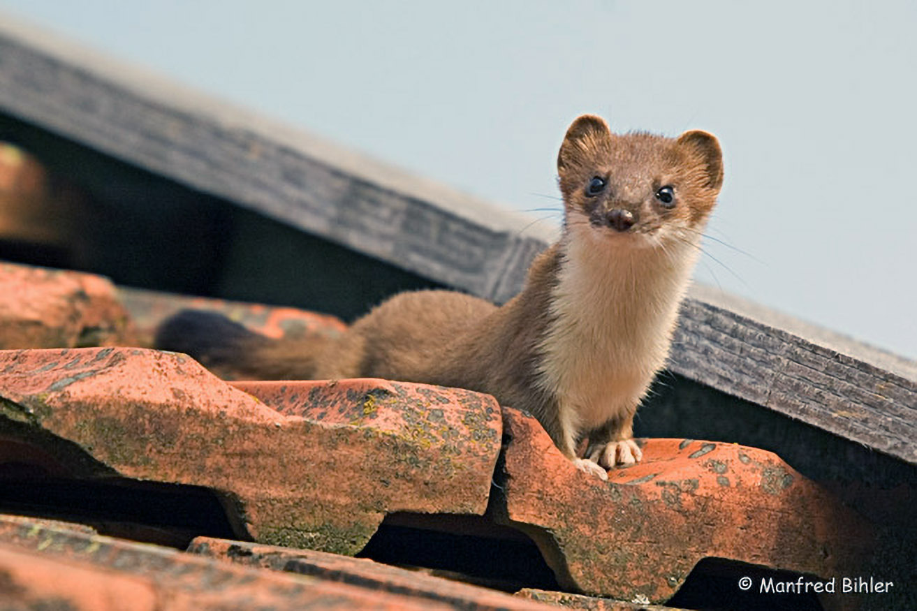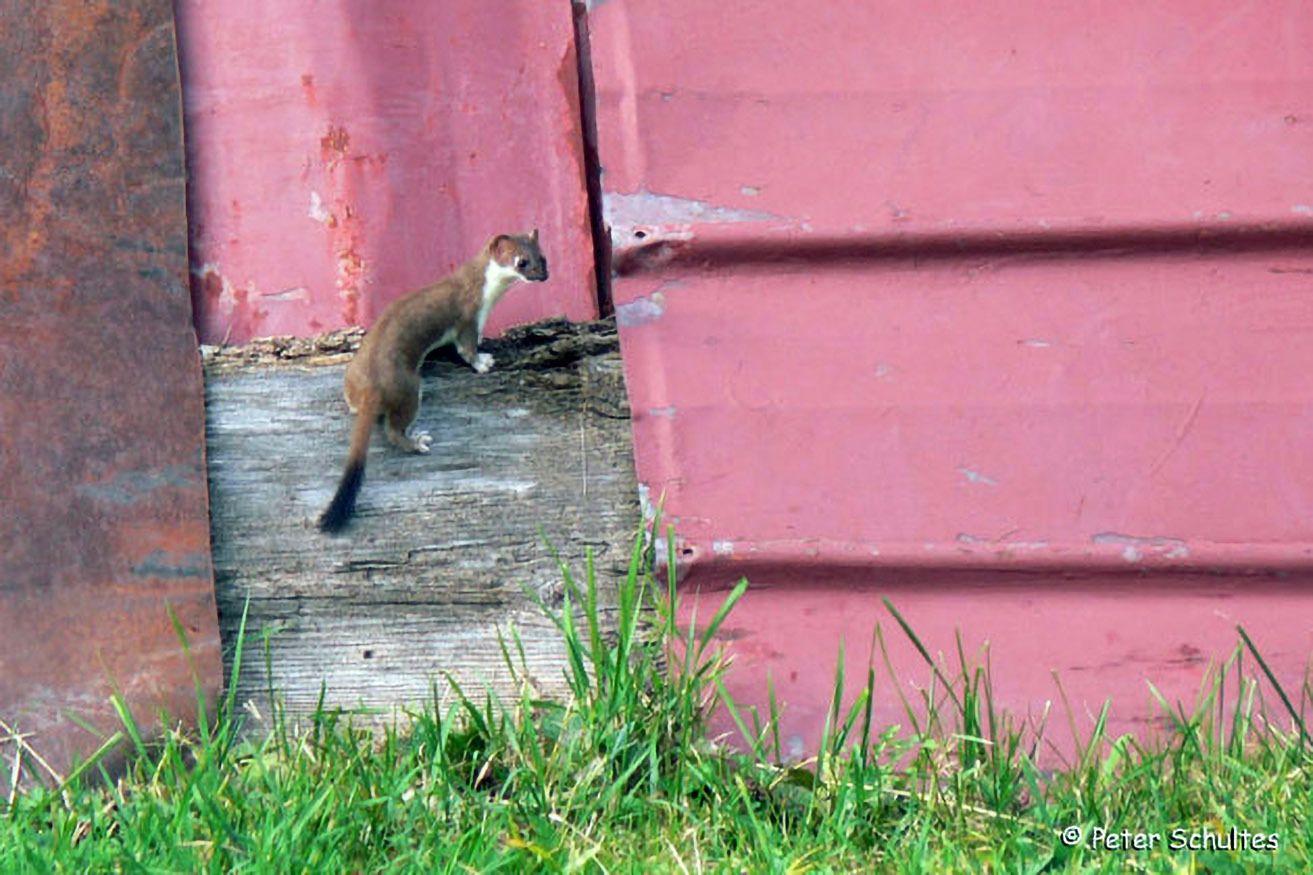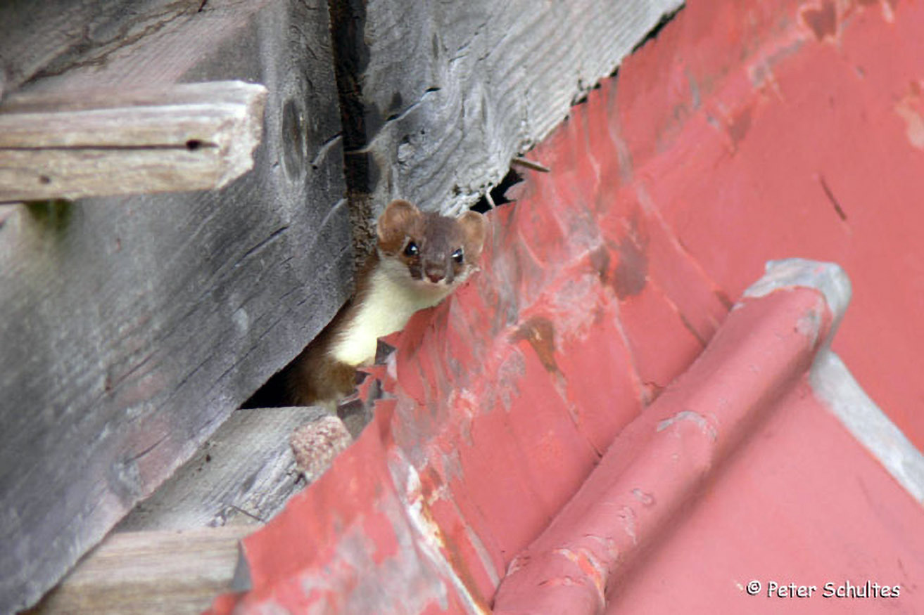 Das Hermelin oder Große Wiesel erkennen wir am lang gestreckten Körper, den kurzen Beinen und dem Schwanz mit schwarzer Endquaste. Im Sommer ist das Fell oberseits braun, unterseits - scharf und geradlinig abgegrenzt - weißlich.