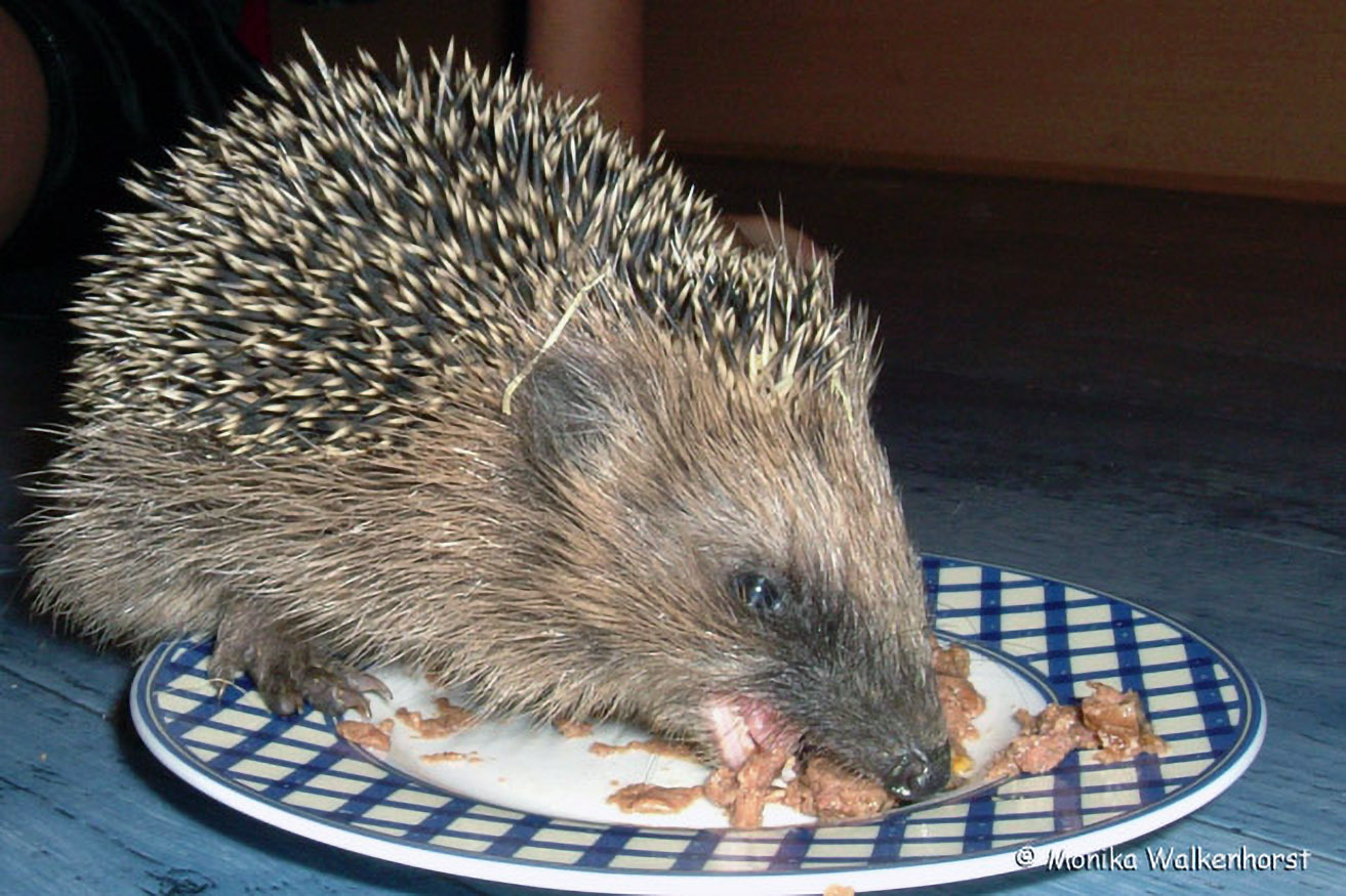 Der nachtaktive Igel gehört wie unsere Fledermäuse und Maulwürfe zu den Insektenfressern. Er ernährt sich von Laufkäfern, Regenwürmern, Schnecken etc. Mitunter vergreifen sie sich aber auch am Katzenfutter.