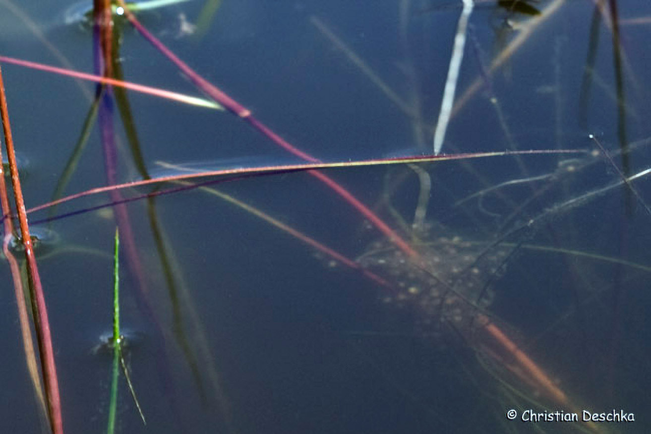 Die kleinen Laichballen werden an Wasserpflanzen befestigt und sind eher schwer zu finden. Aus den Eiern entwickeln sich recht große, goldgrün schimmernde Kaulquappen.