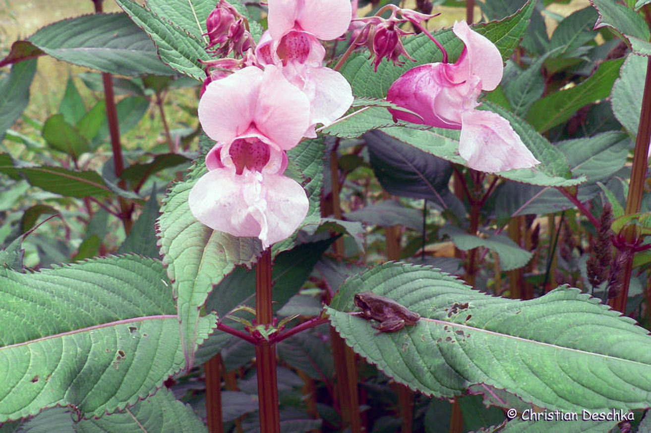 Blütenreiche Hochstauden mit großen Blättern sind für den Laubfrosch besonders attraktiv, da er hier blütenbesuchende Insekten erbeuten kann. Möglicherweise profitiert der Laubfrosch daher vom eingeschleppten Springkraut.