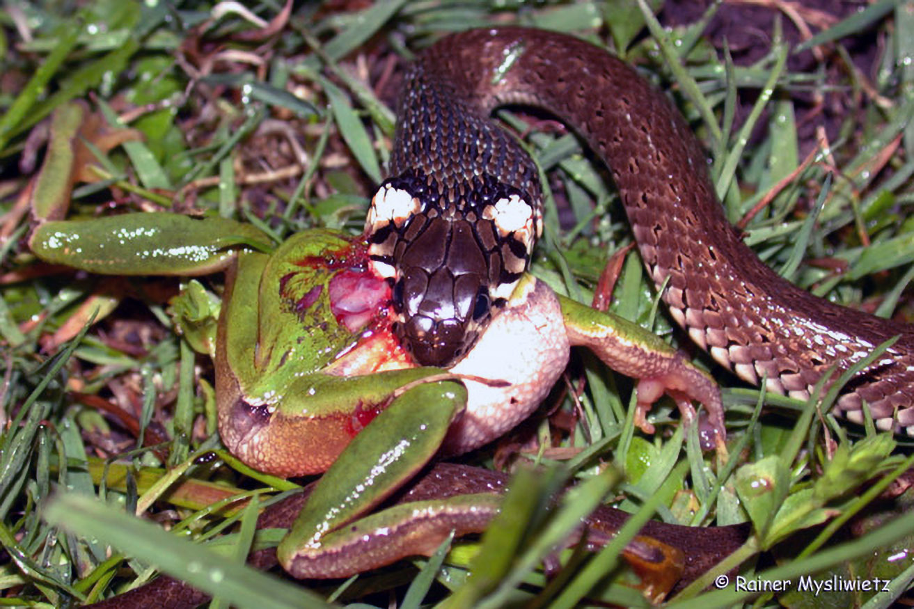 Laubfrösche stehen bei vielen natürlichen Feinden am Speiseplan. Dieser Laubfrosch wird gerade von einer Ringelnatter verschlungen.
