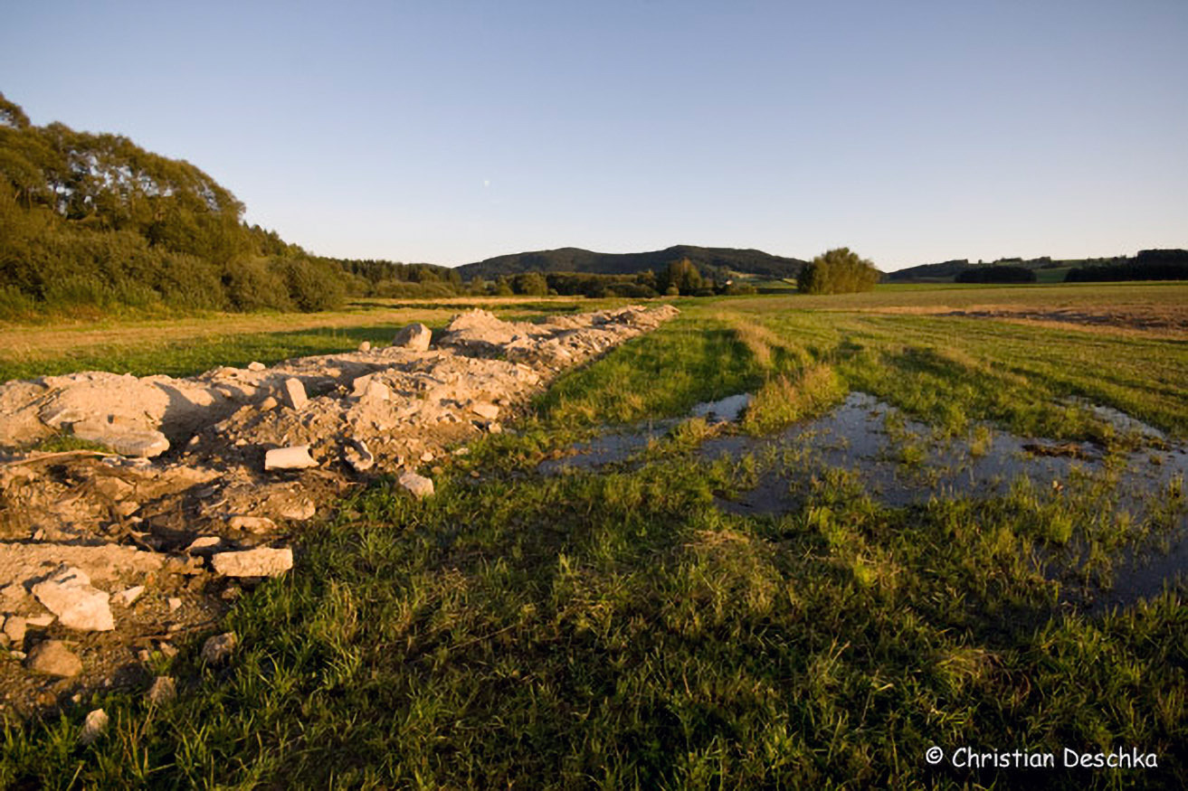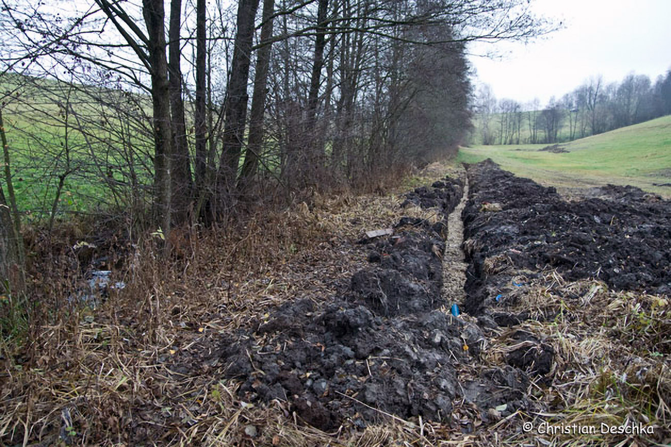 Hier wird gerade eine Drainage angelegt. Dabei wird in einen ca. 60 cm tiefen Graben ein Rohr mit Löchern gegeben. Dieses wird mit Schotter und Erdreich überfüllt und dient der Entwässerung der Wiese in den daneben liegenden Bach.