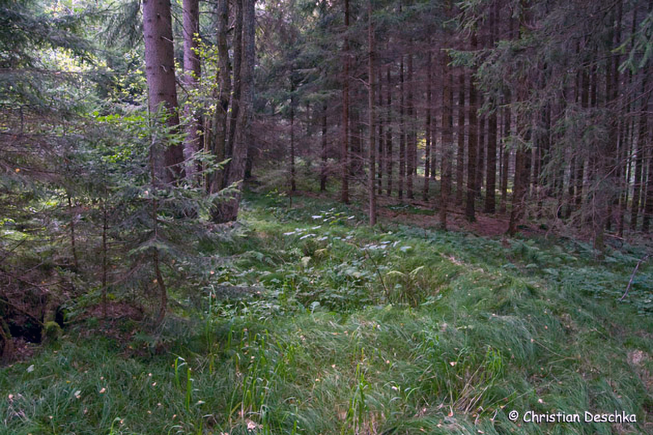 Fast alle dieser "Schwön" verlandeten (wie jene im Bildvordergrund) oder wurden aktiv zugeschüttet. In diesem Fall wurde auch die umliegende Feuchtwiese zerstört, indem sie mit Fichten "zugepflastert" wurde.