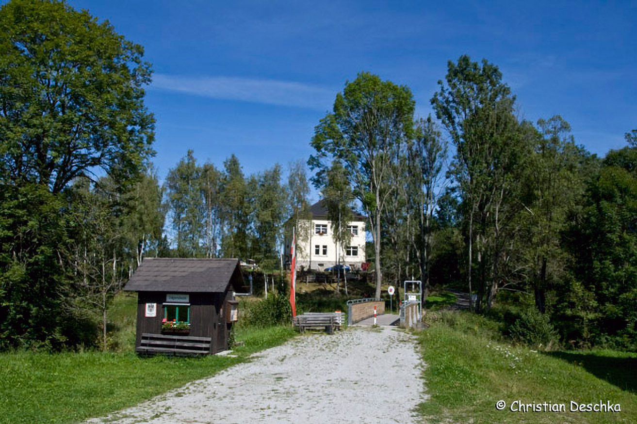 Dort befindet sich nämlich direkt am Ortsplatz ein Infozentrum, das durch ein schmiedeisernes Schild gekennzeichnet ist. Es informiert sowohl über das hiesige NATURA 2000- bzw. Europaschutzgebiet als auch über das Grüne Band.