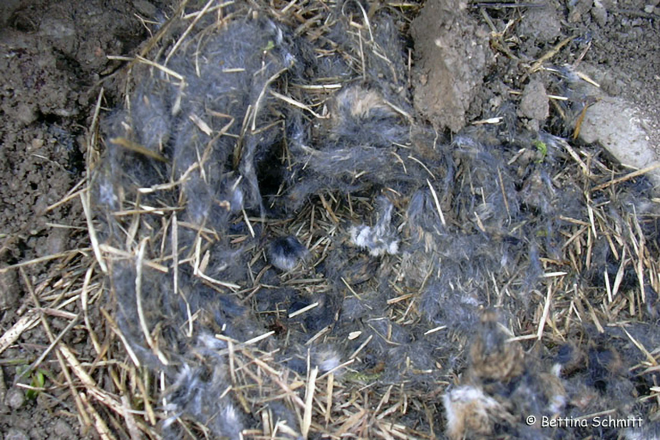 Mauswiesel dringen auch in Mäusenester ein, töten die Bewohner und nutzen z.T. im Anschluss deren Nester als Quartier. Am Bild sehen wir ein derart geplündertes Mausnest.