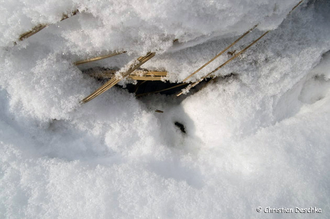 Noch einmal dieselbe Spur von der Seite: In der Bildmitte bewegte sich der Mausjäger unter dem Schnee in Mausgängen fort.