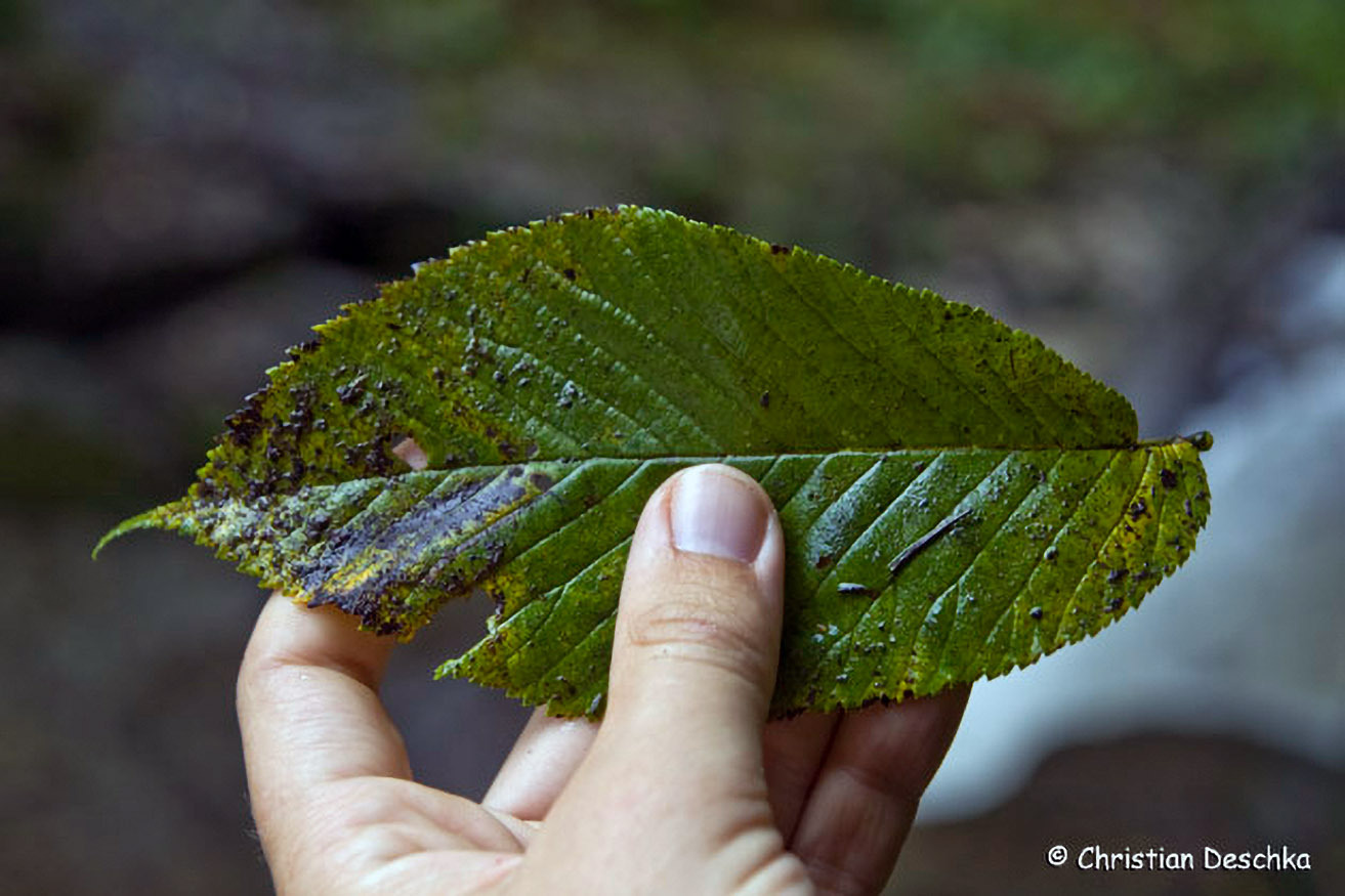 Auf dem Weg finden wir ein Blatt der Flatterulme. Ulmen haben längliche Blätter, die man an der asymmetrischen Basis erkennt.