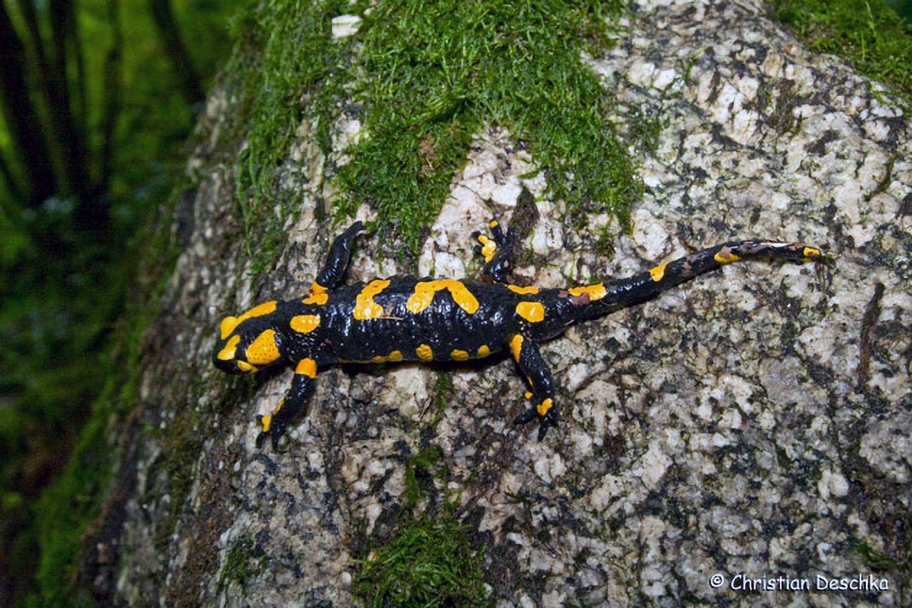 Feuersalamander sind zwar langsame, aber doch geschickte Kletterer. Die gelben Flecken warnen Fressfeinde vor dem Gift, das in Hautdrüsen gebildet wird. Das Fleckenmuster ist so charakteristisch wie unser Fingerabdruck.
