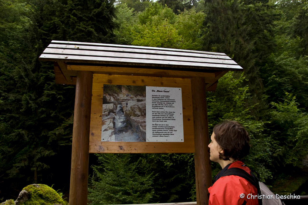 Da dieses dunkle Gesteinsband weniger verwitterungsbeständig ist, hat sich hier der Bach im Laufe der Zeit stärker eingetieft und fließt wie in einer herausgemeißelten Rinne (= "Blaue Gasse").