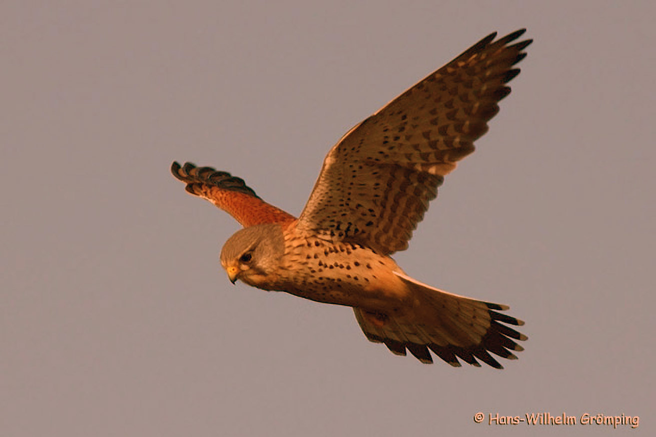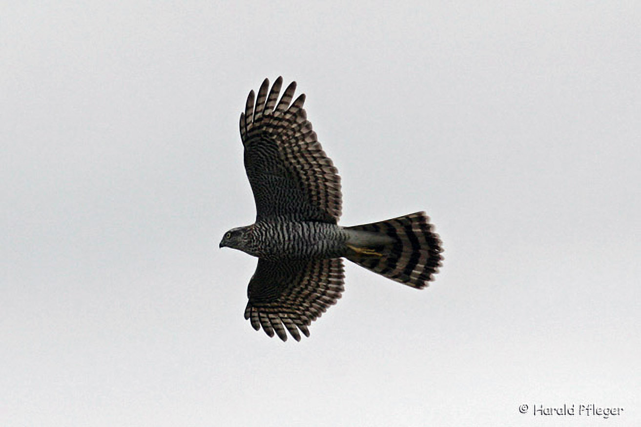 Dieser bräunliche Greif hat zumeist einen hellen Brustfleck. Der Schwanz weist 5-6 schmale Querbinden auf.