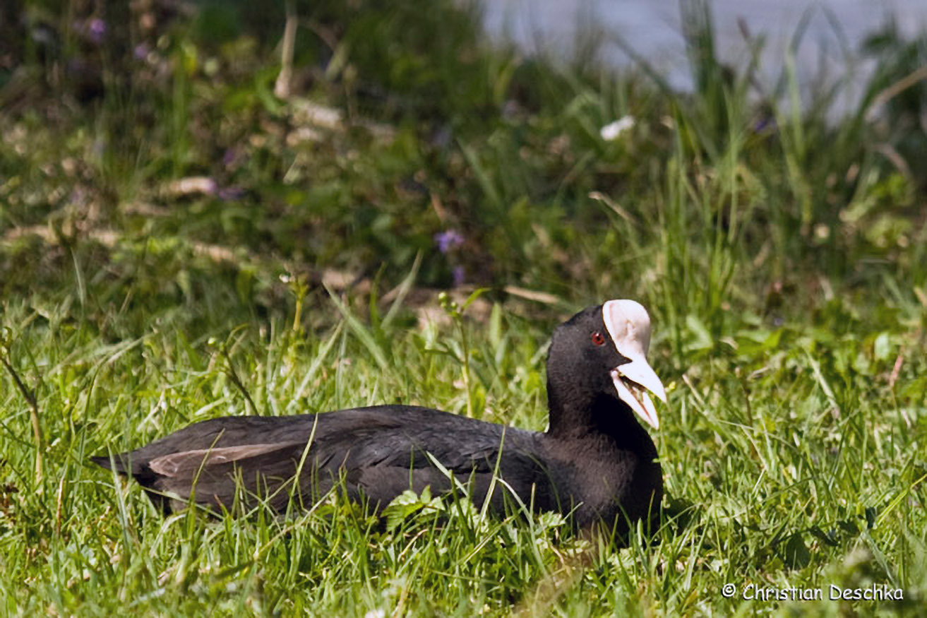 Das schwarze Blässhuhn hat einen weißen Schnabel und einen weißen Stirnschild. Es fühlt sich an nährstoffreichen, seichten Gewässern mit ausgeprägter Ufervegetation am wohlsten. Es kommt an der Donau und an größeren Teichanlagen vor.