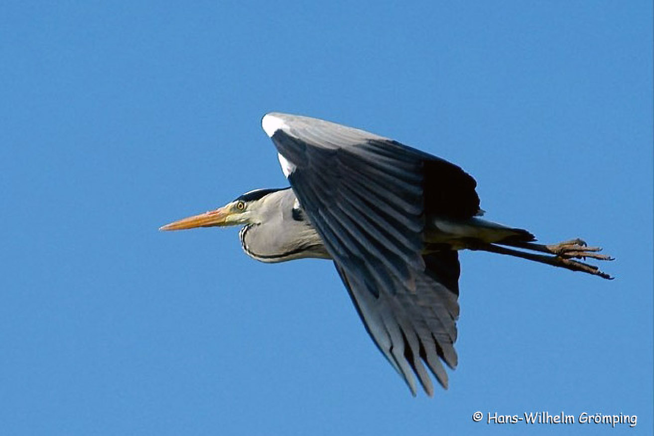 Während Störche im Flug ihren Hals ausstrecken, halten ihn Graureiher S-förmig eingezogen. Nicht selten stoßen Graureiher im Flug krächzende Laute aus, durch die man auf die Tiere aufmerksam wird.