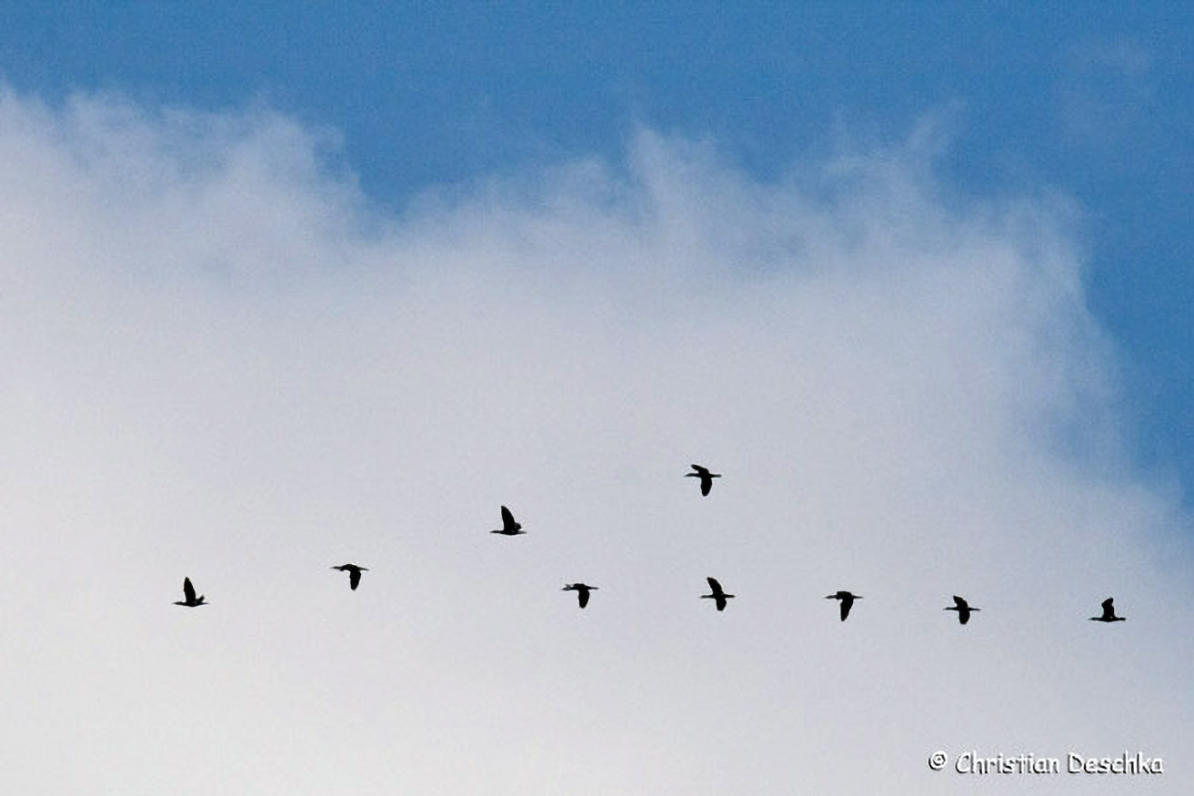 Ziehende Trupps sind an der Keilformation und an den kreuzförmigen Umrissen von Einzeltieren erkennbar.
