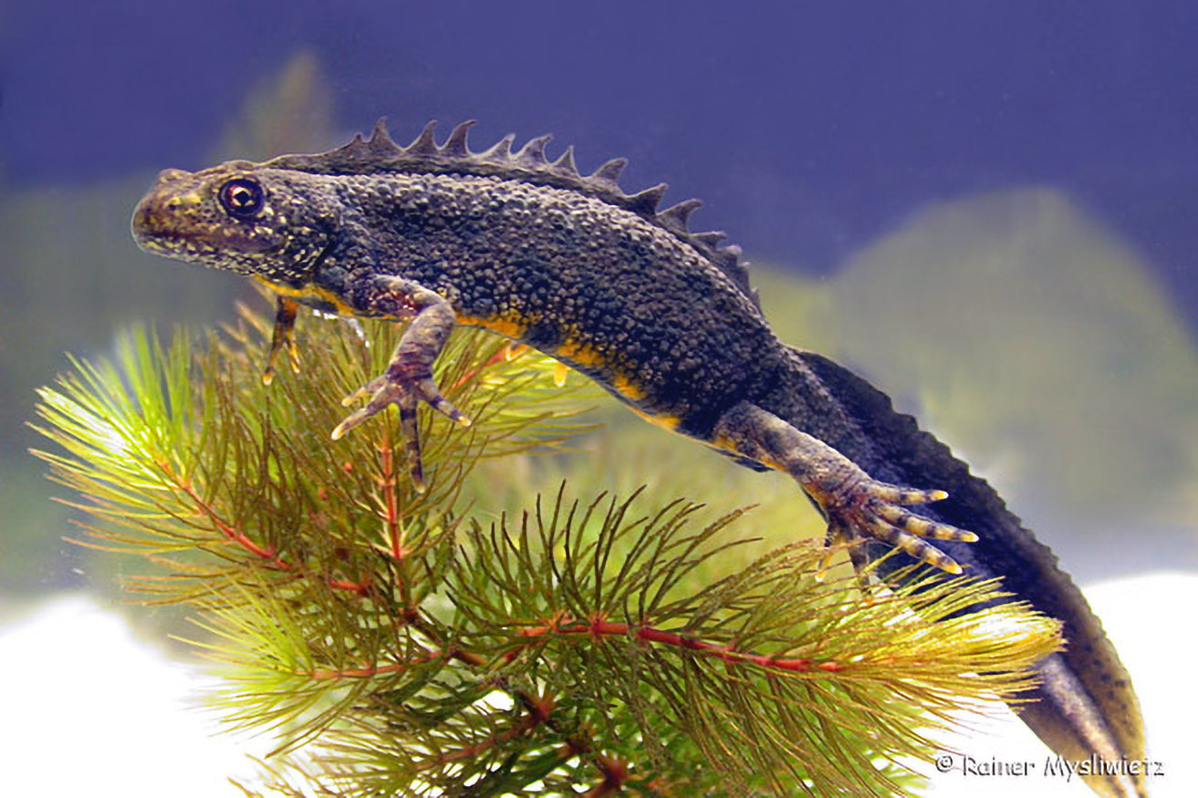 Der Kammmolch ist im Frühling am Rückenkamm und dem weißen Streifen am Schwanz erkennbar. Er bewohnt vor allem größere und tiefe Gewässer mit ausgeprägtem Bewuchs an Wasserpflanzen. An diesen legt er die Eier ab.