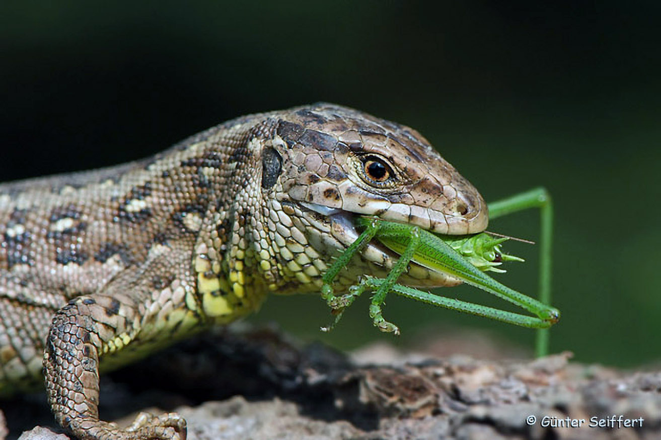 Zauneidechsen ernähren sich - wie andere Eidechsen auch - von Insekten, Spinnen, Regenwürmern, ... Dieses Exemplar verschlingt gerade eine Heuschrecke.