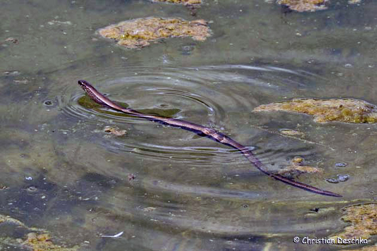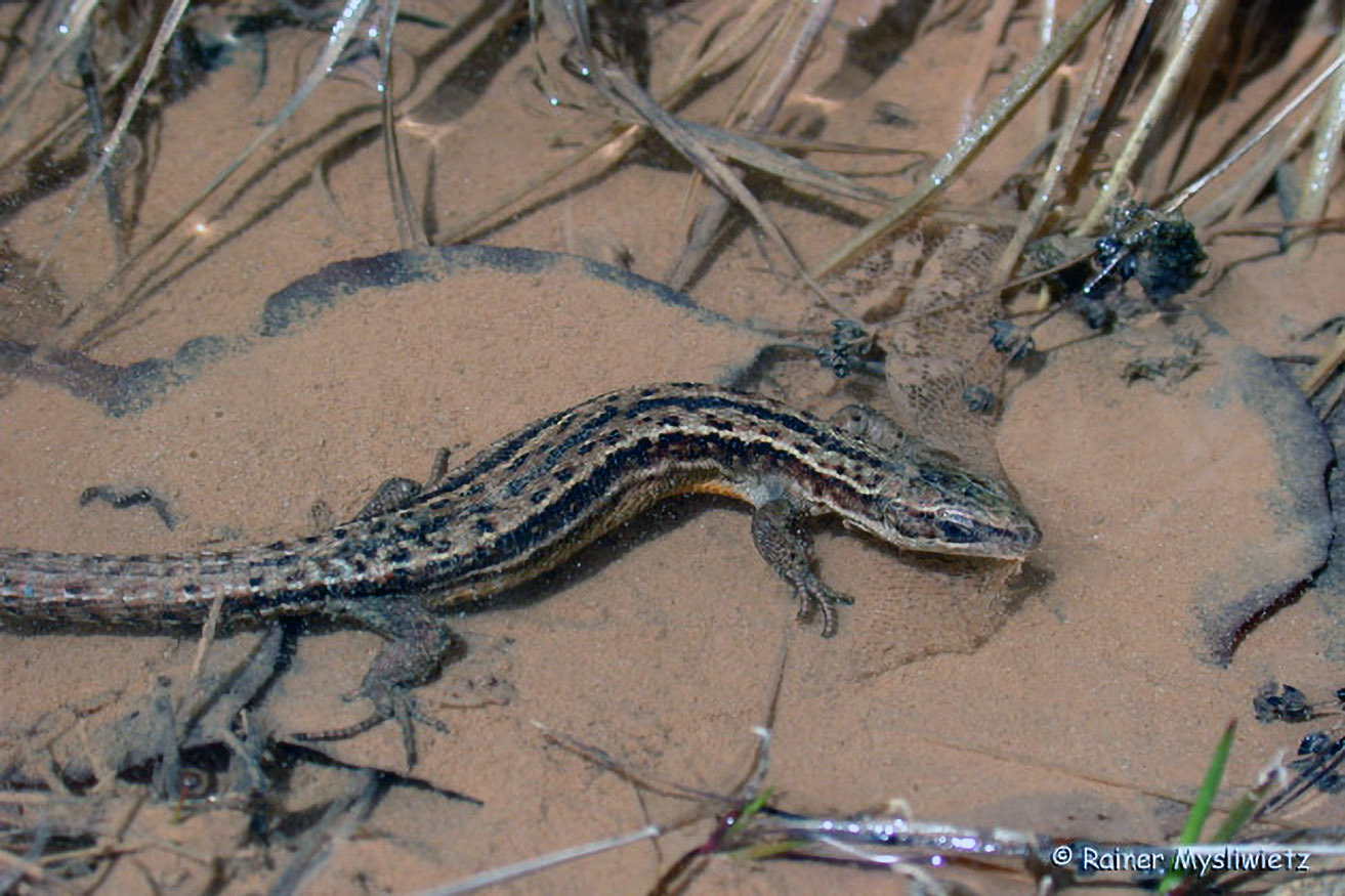 Bei Gefahr flüchtet sie gerne ins Wasser. Diese Eidechse wartet am Grund einer Pfütze, bis die Luft wieder rein ist.