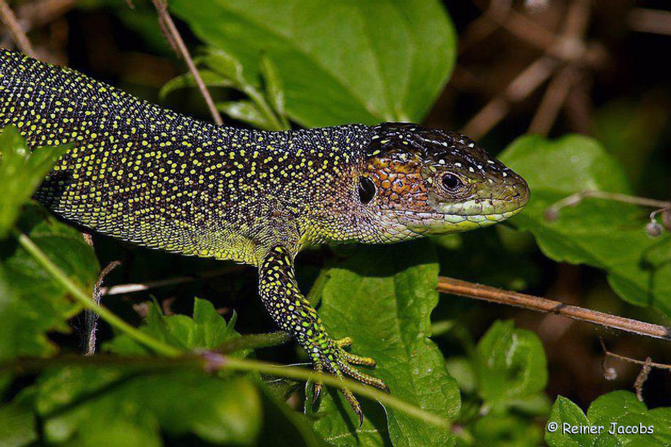 Hier ist das etwas schlichter gefärbte Weibchen abgebildet. Smaragdeidechsen mögen - neben schütteren Sonnplätzen - auch eine starke Bodenbedeckung, in der sie geschickt klettern.