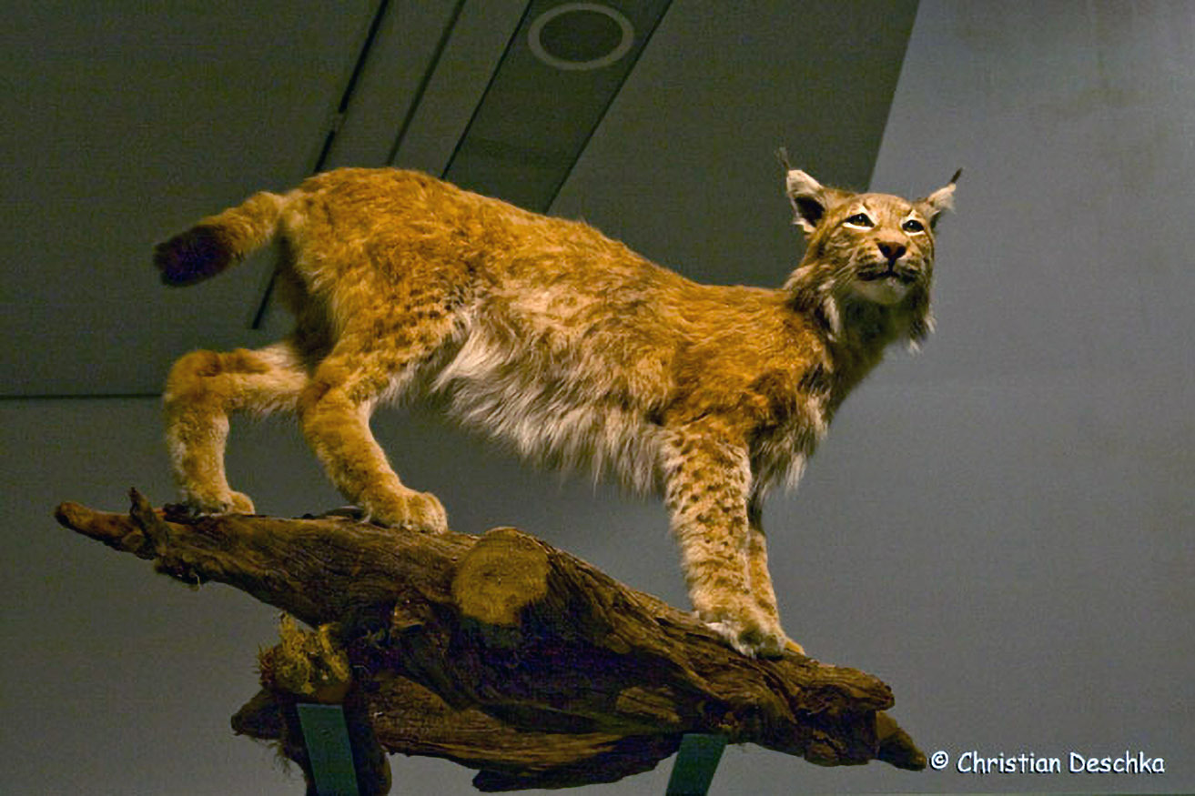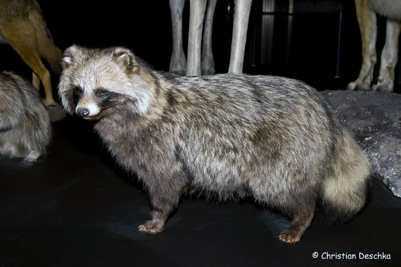 Gleich daneben finden wir dieses Präparat eines Marderhundes. Dieser Neubürger stammt aus Ostasien, wurde aber vom Menschen weiter westlich angesiedelt und erobert nun Europa. Dieses Exemplar wurde in der Nähe von Putzleinsdorf erlegt.