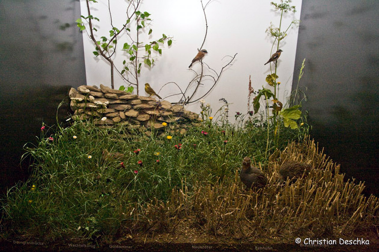Diese Vitrine stellt die artenreiche Kulturlandschaft mit Rebhuhn, Braunkehlchen, Wachtelkönig, Neuntöter, Goldammer, ... vor.