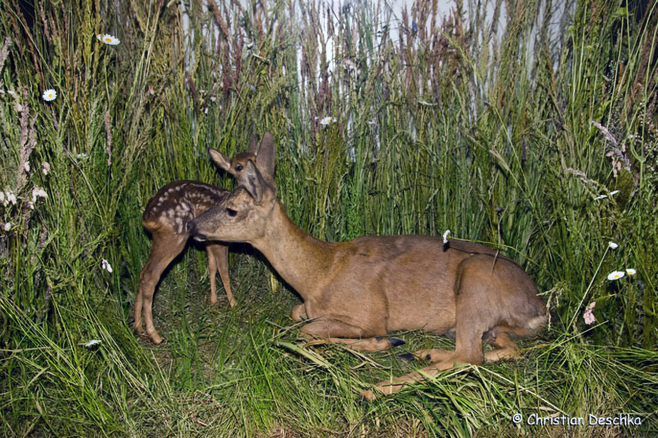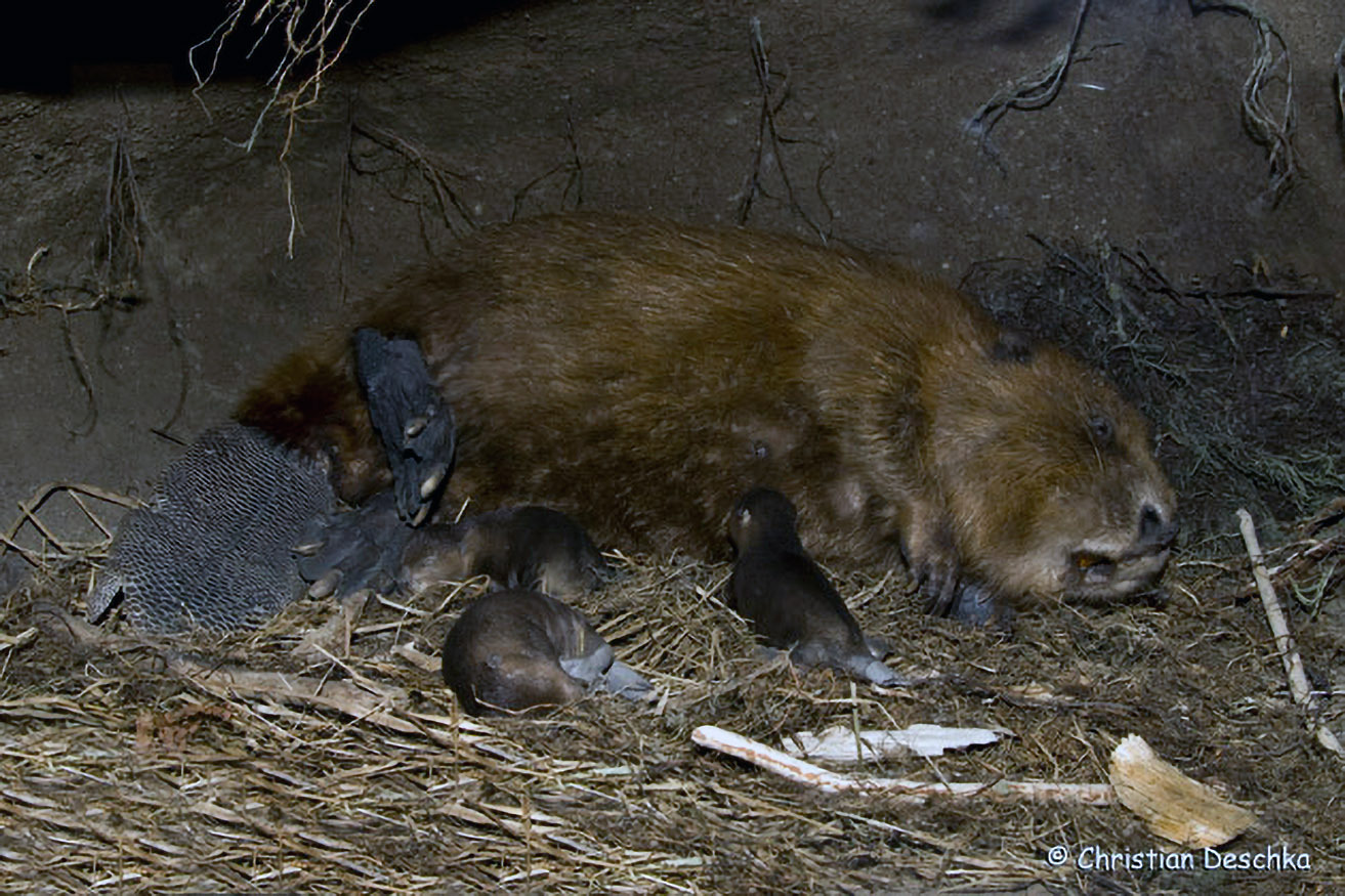 Hier bekommen wir einen Einblick in eine Biberhöhle, in der ein Biberweibchen seine Jungen säugt. Durch die exzellente Qualität der Präparate wirken die Dioramen sehr lebendig.