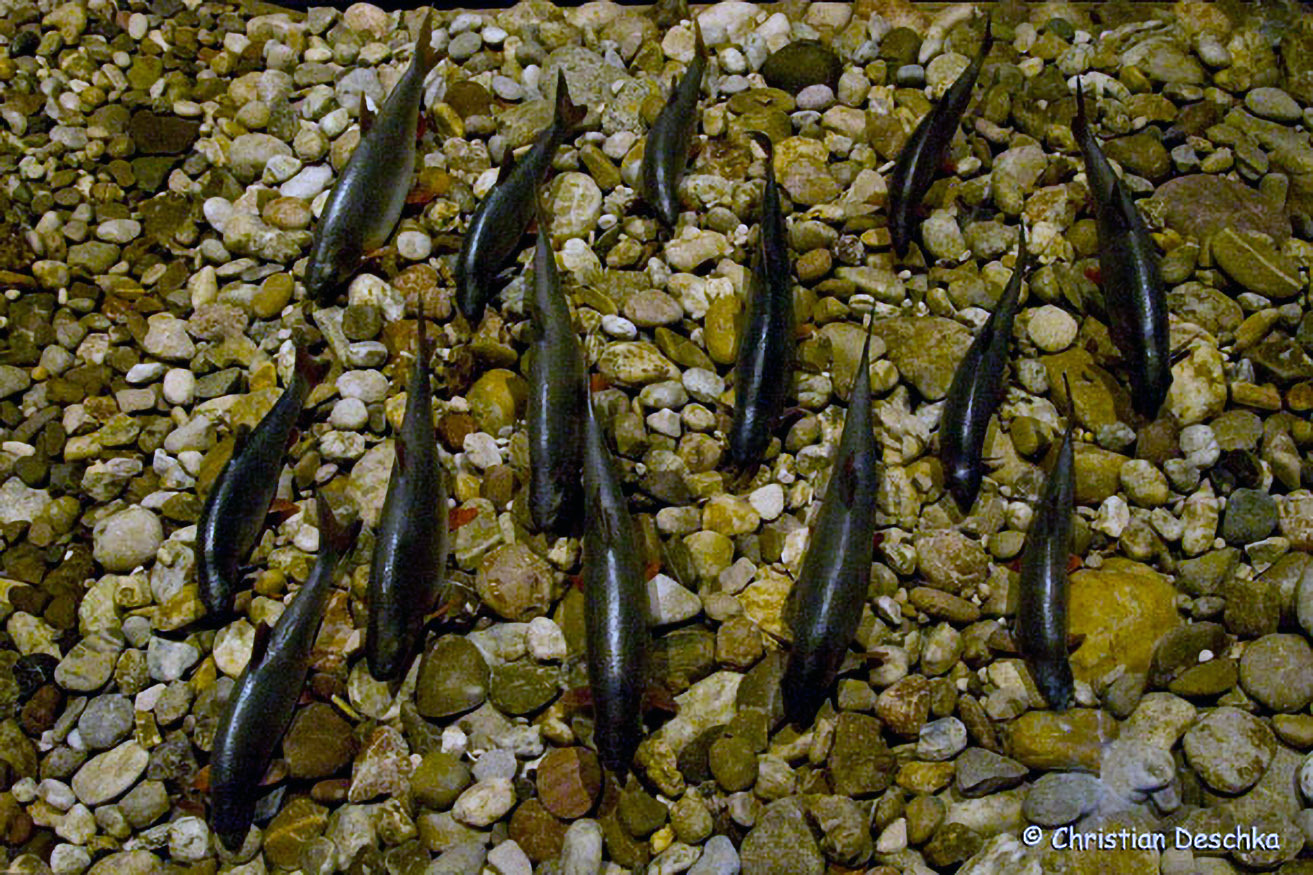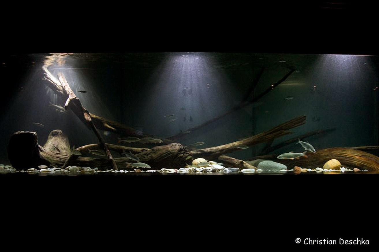 Dieses Diorama entführt den Besucher in eine Zeit, in der die Donau noch sehr fischreich war und die Donaufische noch ungestört wandern konnten. Heute verhindern hohe Staumauern solche Laichwanderungen.