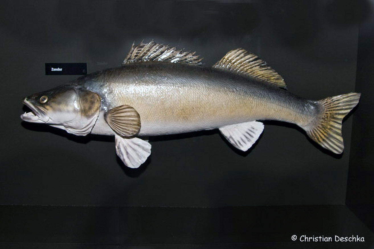 Einige Fischarten werden auch als Präparate vorgestellt. Hier sehen wir den Zander, einen Raubfisch aus der Familie der Barsche. Kennzeichnend ist seine zweigeteilte Rückenflosse, wobei der vordere Teil Stachelstrahlen trägt.
