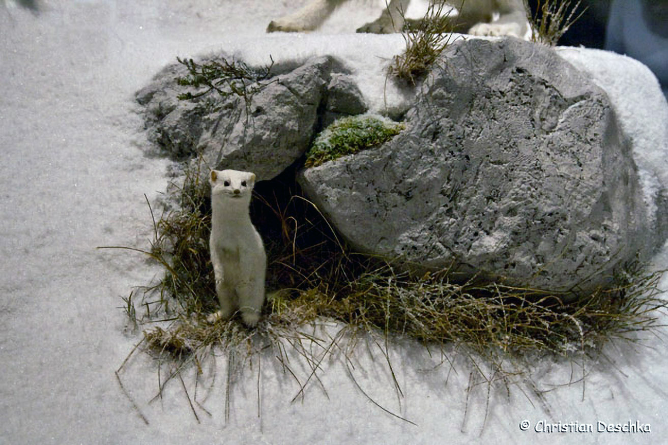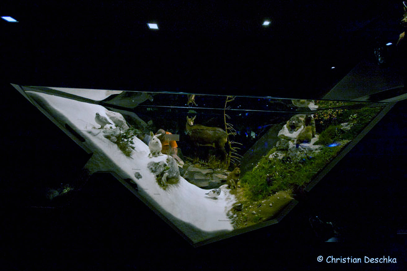 In diesem Diorama wird die Lebensweise einiger Gebirgsarten (Alpenschneehase, Alpenschneehuhn, ...) vermittelt. Die Gegenüberstellung Winter-Sommer ermöglicht einen guten Vergleich unterschiedlicher Färbungen.