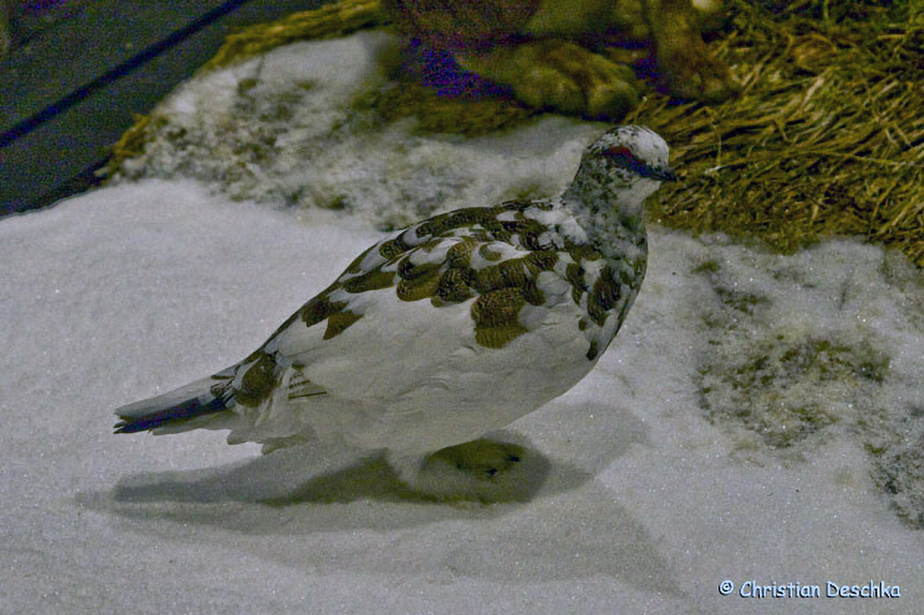 Hier ist das Präparat eines Alpenschneehuhns abgebildet, das gerade sein Federkleid wechselt (Sommer bräunlich > Winter weiß).