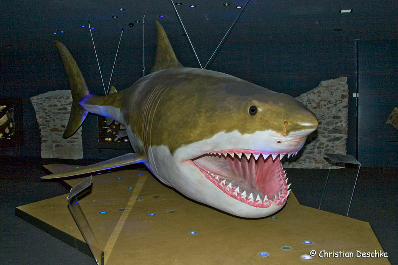 Dort kann man heute noch in Schottergruben mit etwas Glück fossile Haifischzähne finden. In der Vitrine hinter dem Hai wird unter anderem eine fossile Rippe einer Seekuh ausgestellt, die Bissspuren dieses Haies trägt.