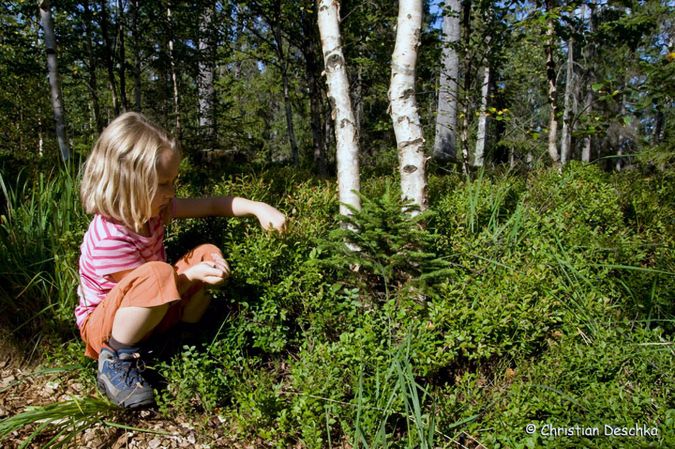 Auf diesem Wurzelteller eines umgestürzten Baumes wachsen Heidelbeeren und Preiselbeeren sowie grüngraue Flechten.
