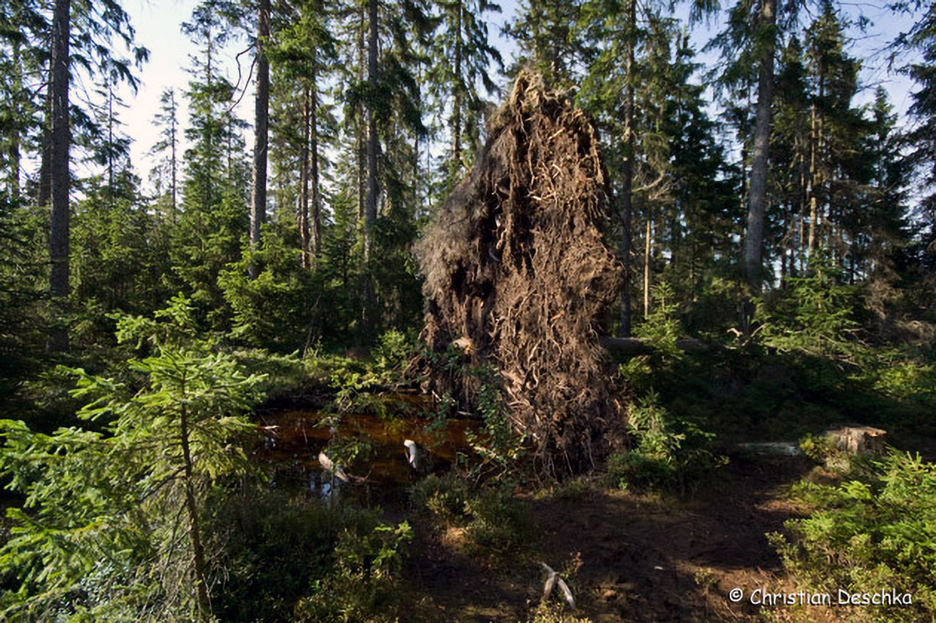 An dieser entwurzelten Fichte können wir den hohen Wasserstand im Moor sehen. Wo früher das flache Wurzelteller war, ist jetzt ein kleiner Tümpel - Lebensraum für Amphibien, Libellen, ...