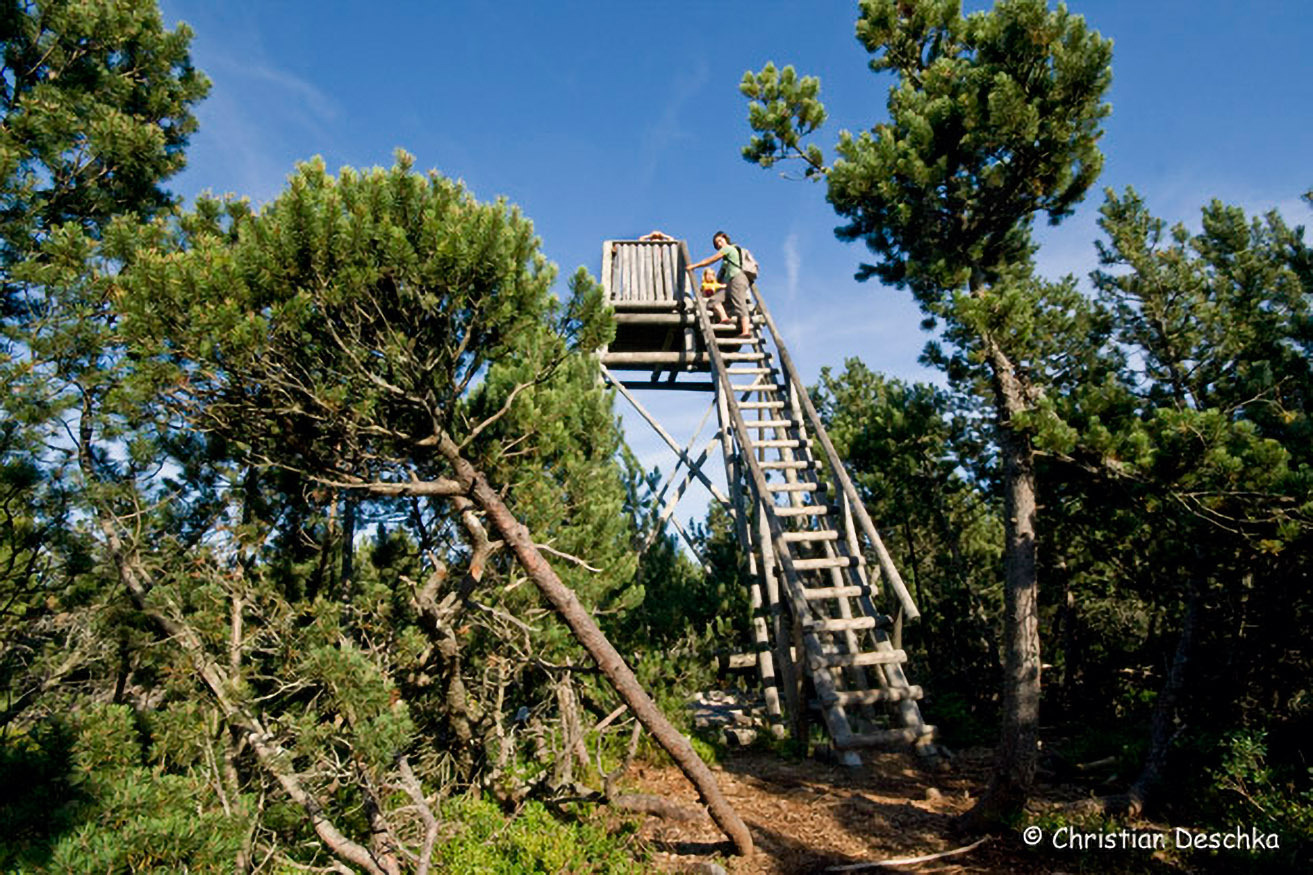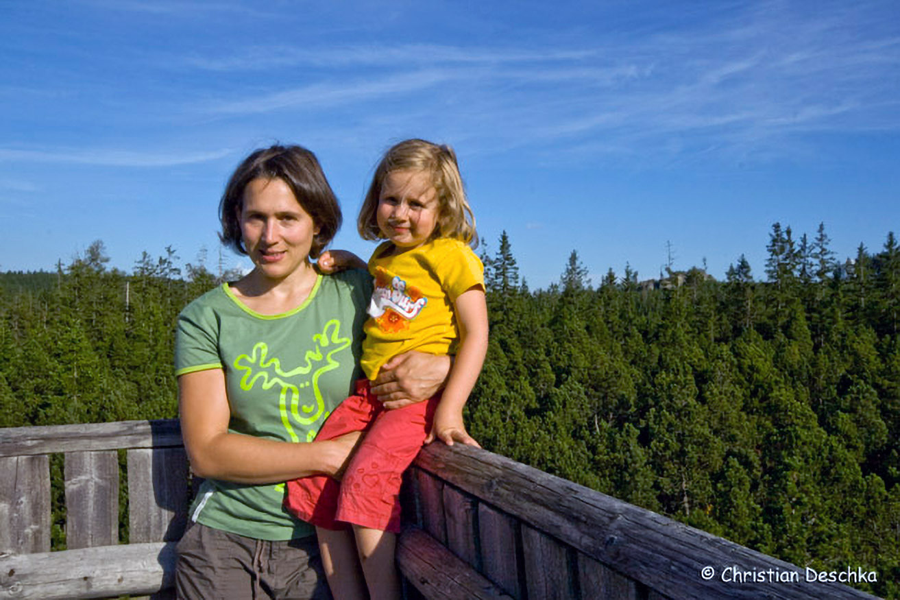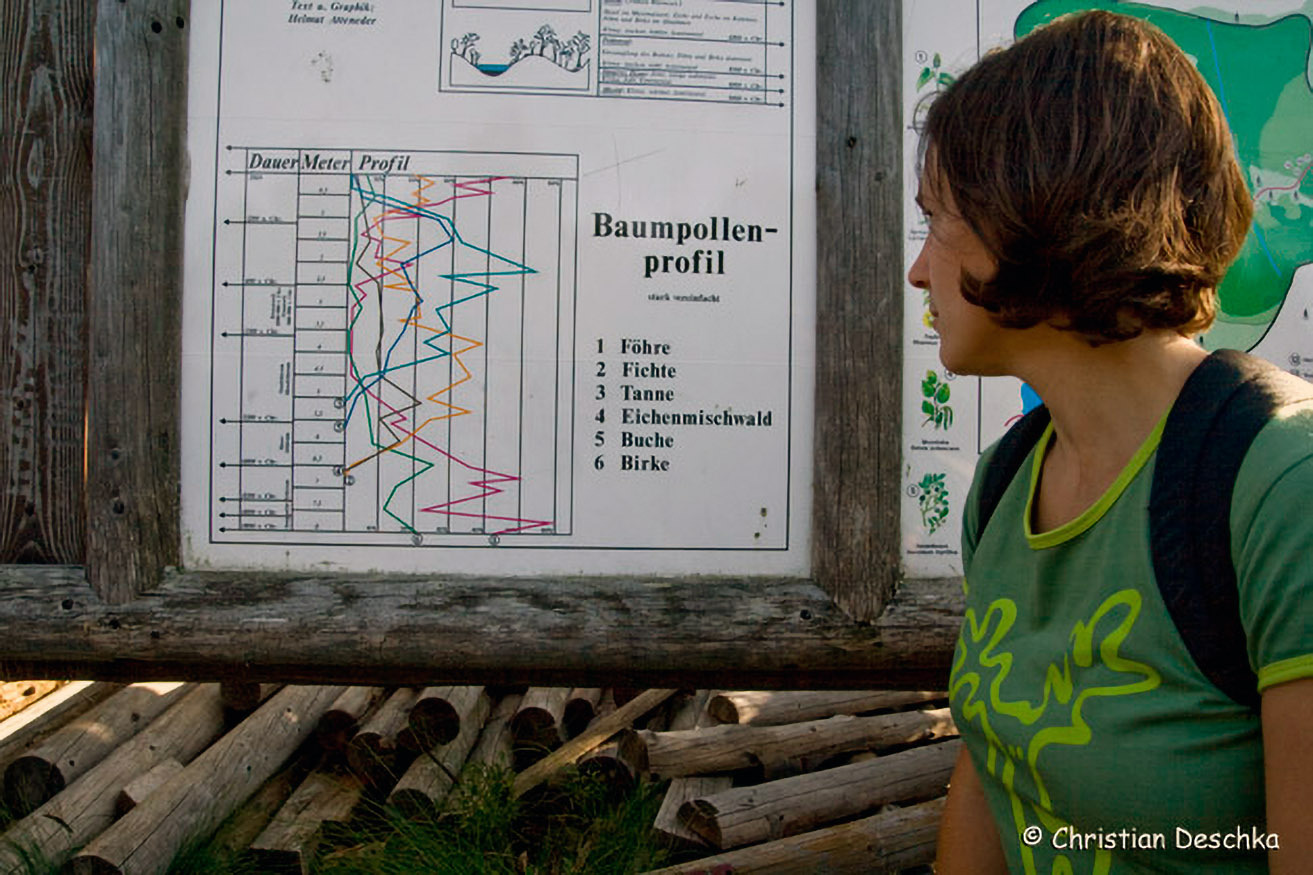 An der Basis des Turms erläutert eine Tafel die Entstehung des Moores und die Tatsache, dass Moore die Vegetation seit der Eiszeit dokumentieren. Im Torf des Moorkörpers werden nämlich neben Pflanzenteilen auch ...