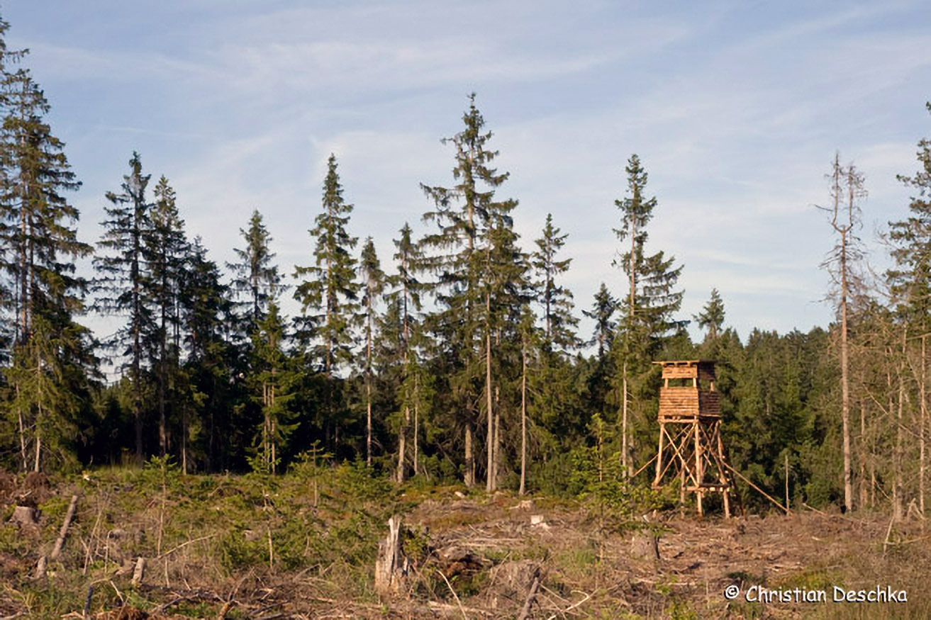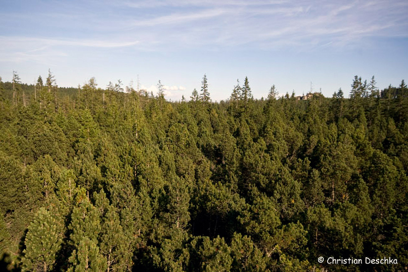 Der erste Abschnitt des Weges führt durch in dieser Gegend leider sehr weitverbreitete Fichtenmonokulturen. Die gleich alten Bäume bilden instabile Bestände ("Altersklassenwald") und sind anfällig für Borkenkäfer und Windwürfe.