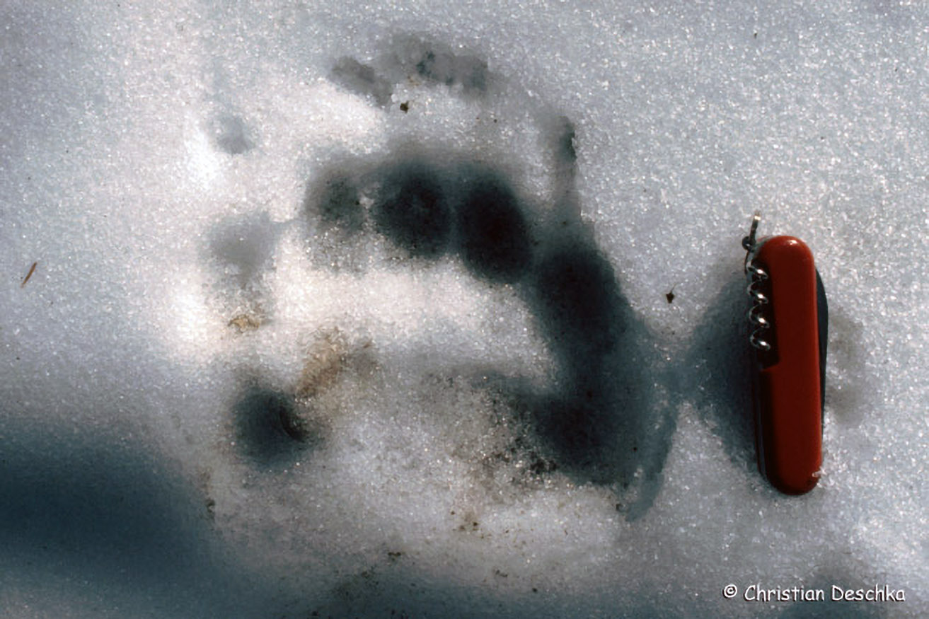 Hier sehen wir zwei typische, faustgroße, asymmetrische Luchstrittsiegel. Wie bei allen Katzen fehlen die Krallenabdrücke.