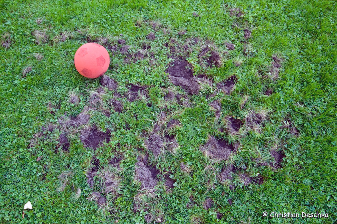 Wenn der Rasen so wie hier umgegraben ist, dann war ein Dachs zu Besuch und hat Engerlinge (Maikäferlarven) aus dem Boden ausgegraben.