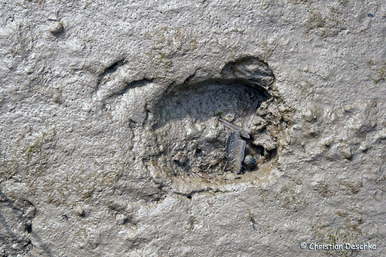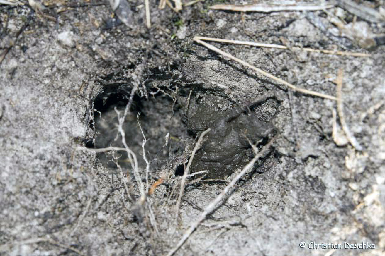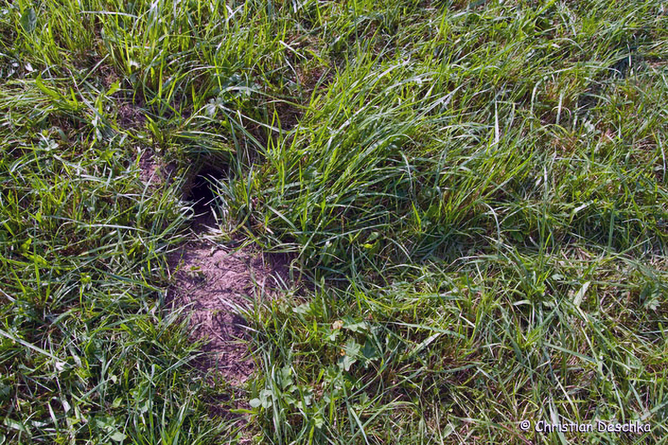 Vor dem Eingang zum Bau befindet sich meist ein Erdhaufen aus Aushubmaterial. Dort findet man mitunter auch das eine oder andere Trittsiegel.